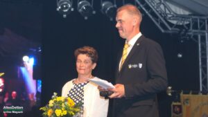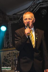 Und wie gerne er Austumer ist, führte er dann weiter aus: Von dem Moment an, wo er dem Vorstand die Zusage gab, die Schirmherrschaft zu übernehmen, war er auch in die Arbeit des Festausschusses eingebunden. Fehlings lernte hier eine tolle Gemeinschaft kennen, bestätigte voller Stolz das Engagement jedes einzelnen Festausschussmitgliedes. Berichtete von Ritualen, die ihm bislang nicht bekannt waren: So wird bei jedem Jubelfest eine Flasche vergraben, die dann beim nächsten Jubiläum wieder ausgegraben und gemeinsam getrunken wird. Jetzt hat sich der Geschmack des Schaumweines, der vor 25 Jahren vergraben wurde, nicht gerade verbessert, so dass ihm die Idee kam, eine Flasche Whiskey mitzubringen, der bekanntlich mit zunehmenden Alter immer besser wird. Zur Verköstigung dieses Tropfens beim nächsten Jubiläum hat er sich dann gleich selber eingeladen – ob das schon eine versteckte Zusage auf eine weitere Schirmherrschaft ist?