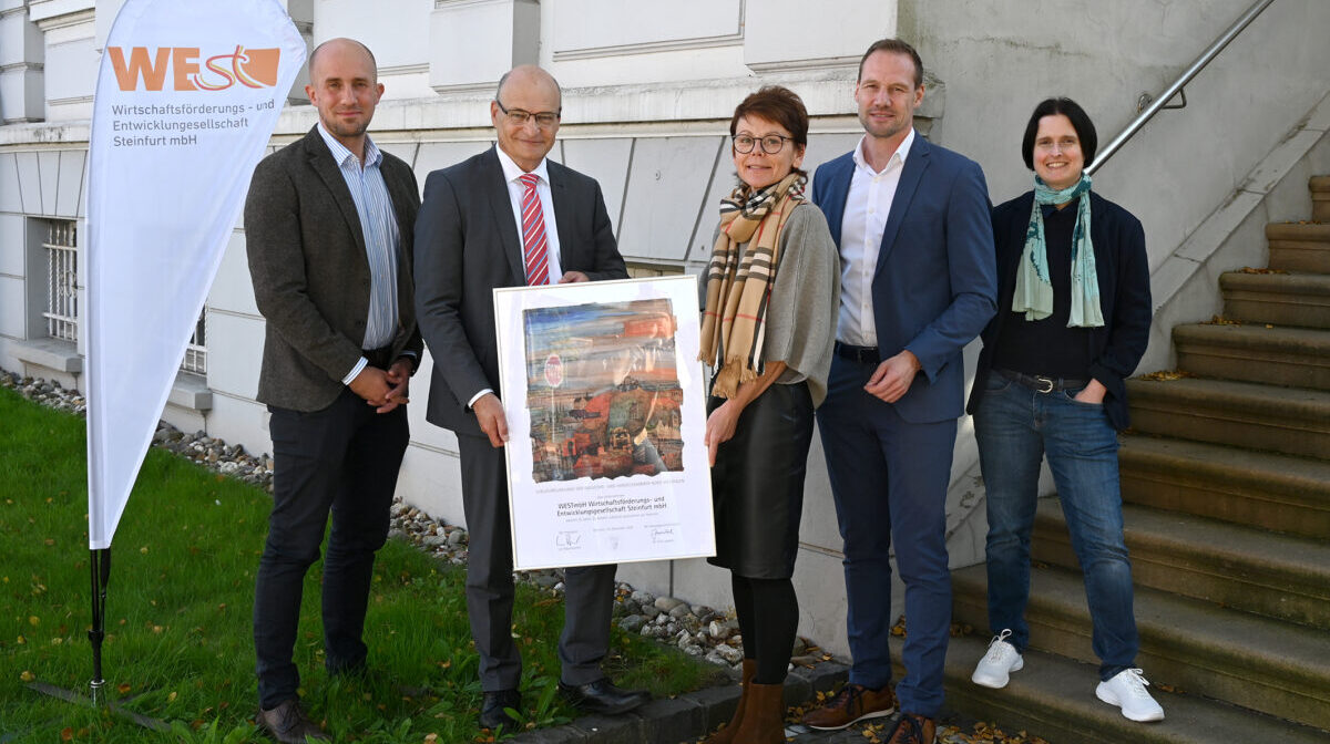 Die Wirtschaftsförderungs- und Entwicklungsgesellschaft Steinfurt mbH (WESt) feiert in diesem Jahr ihr 25-jähriges Bestehen. Zu diesem Anlass überreichte die Industrie- und Handelskammer (IHK) Nord Westfalen der WESt-Geschäftsführung um Christian Holterhues und Sonja Raiber eine Jubiläumsurkunde – und nutzte den Termin zugleich, um den neuen Leiter des IHK-Standorts Westmünsterland in Bocholt, Dr. Fabian Schleithoff, vorzustellen.