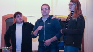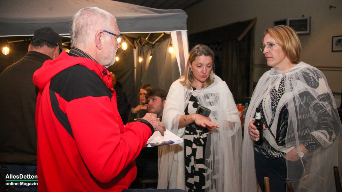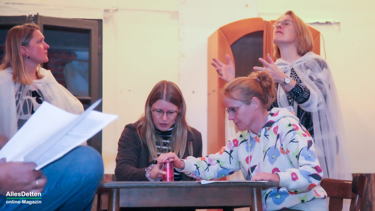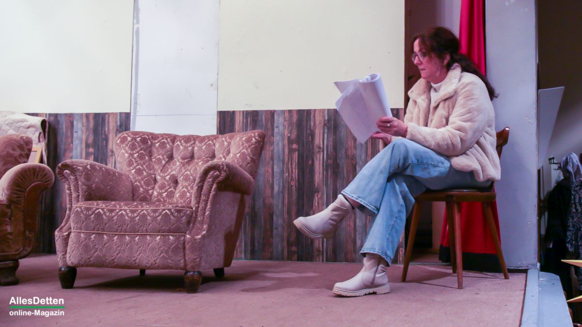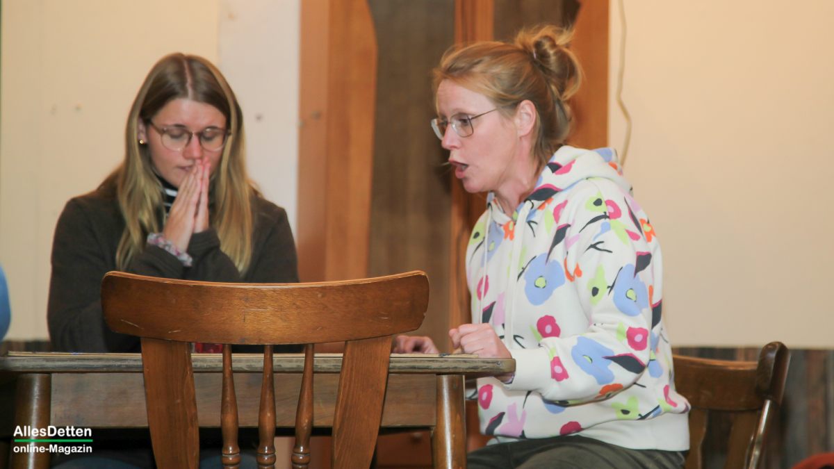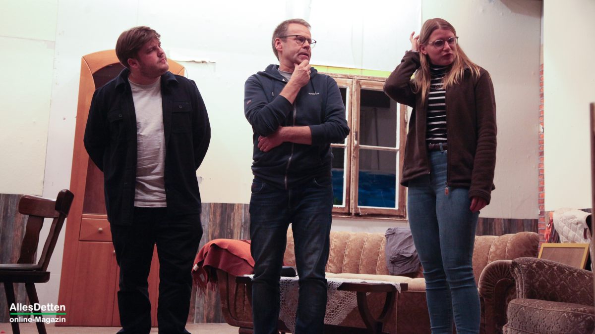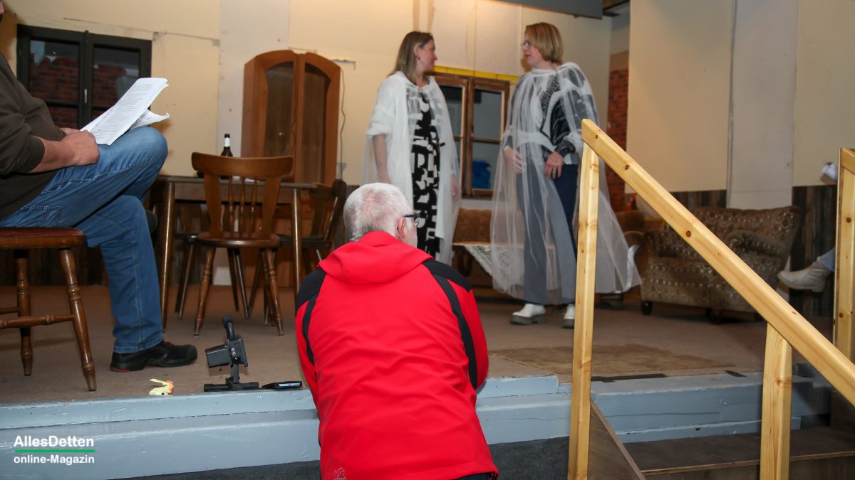 … das kann eigentlich nur bedeuten: Die Laienschauspieler der Ahlinteler Schützengesellschaft sind wieder aktiv! – Genau so ist es, genau heute in 14 Tagen ist Premiere. AllesDetten war in dieser Woche bereits bei den Proben dabei, konnte sich den dritten Akt schon „vorstellen“, – denn noch bedarf es einiger Fantasie denn die Kulissen hinterlassen eher den Eindruck eines verlassenen, seit Jahren leerstehenden Hauses, dessen einzige Perspektive der Abrissbagger zu sein scheint. Auf dem Saal sind die Stühle noch gestapelt an den Seiten, auf dem Tisch vor der Bühne stehen allerlei Kaltgetränke, Weingummi und Schoki, die Schauspieler sind mit privater Unterhaltung intensiv beschäftigt. – So der erste Eindruck, doch dann kommt das Kommando von Regisseur Heinz Laumann und alles geht auf Position. „Wir waren bislang bei den Proben noch nie vollständig, irgendeine Rolle musste immer von jemand anderem gesprochen werden.“