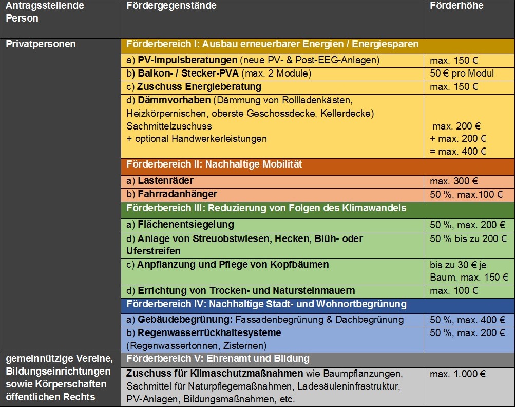 Gemeinnützige Vereine, Bildungseinrichtungen und Körperschaften öffentlichen Rechts können im Förderbereich „Ehrenamt und Bildung“ Zuschüsse bis zu 1.000 Euro für individuelle Klimaschutzmaßnahmen beantragen.