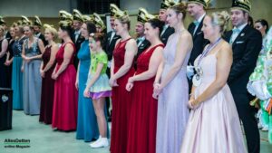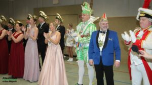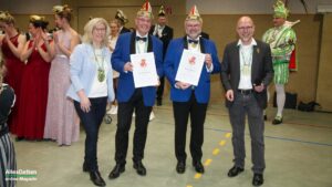 Rund ging es auch beim traditionellen Familiennachmittag des TSC KG Emsdetten in der Mehrzweckhalle Sinningen. Hier wurden interne Ehrungen vorgenommen, natürlich auch gezeigt, wofür man während des ganzen Jahres trainiert. Als das Stadtprinzenpaar mitsamt Gefolge dann Einzug hielt, gab es noch eine besondere Ehrung: KGE-Präsident Helmuth Schäckel und Vize-Präsident Stefan Albers sind gewissermaßen auf Abschiedstour. Für die beiden ist es die letzte Session. Für die stets gute Zusammenarbeit mit der KGE bedankte sich die Vorsitzende des TSC, Gaby Frede, mit zwei Urkunden und donnerndem Applaus der Tänzerinnen im Hintergrund.