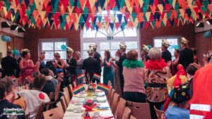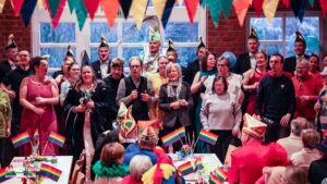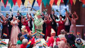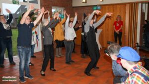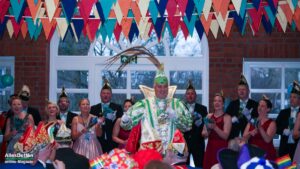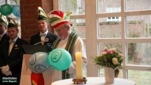 Mit einem Wortgottesdienst begann der Kunterbunte Nachmittag. Dieser fand in den Jahren vor Corona immer in der Marienkirche statt, da hier aber aktuell nicht geheizt wird, ist man direkt in die Arche gegangen. Bernhard Köster konnte bildete mit einer närrischen Predigt den Auftakt zu weiteren karnevalistischen Aktionen. Die Gruppe Hummelflug tanzten zunächst alleine, dann durfte der Elferrat tanzen und schließlich war gar nicht mehr zu erkennen, wer denn jetzt zu wem gehört. Die Gruppen mischten sich untereinander, tanzten und die Polonaise führte nicht nur durchs Haus sondern auch in den angrenzenden Garten.