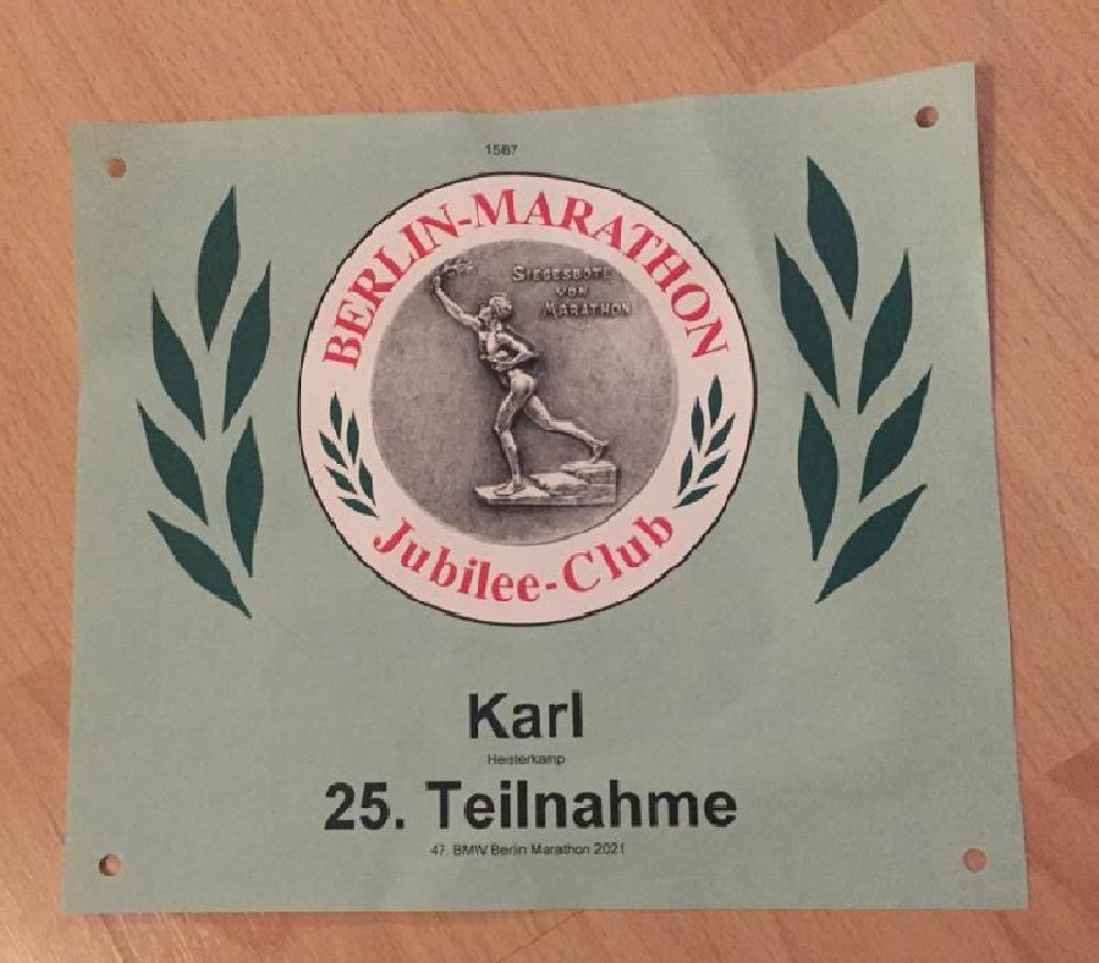 Karl Heisterkamp ging nur zwei Wochen nach seinem erfolgreich bewältigten 19. Münster Marathon gut vorbereitet in Berlin an den Start. Bereits nach 2:18:51 Stunden hatte er die erste Hälfte bewältigt. Mit einer guten Zeit von 5:08:54 Stunden wurde Karl Heisterkamp bei seinem Berliner Jubiläumsmarathon Elfter in der Altersklasse M 75 und 14612. in der Gesamtwertung der Männer. Mit nun 25 erfolgreichen Teilnahmen am Berlin Marathon bleibt er Rekordhalter der LGE. Reinhard Schwering steht bei 24, Günter Dieckmann bei 22 erfolgreichen Teilnahmen am Berlin Marathon.