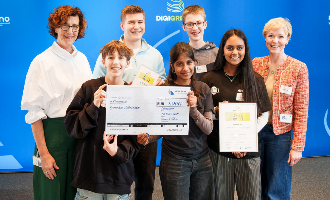 Das Gymnasium Martinum Emsdetten hat am Donnerstag, 19.03.2026 mit dem Projekt „martinum.media.mobile“ den Schulwettbewerb DIGIGREEN gewonnen und mit zwei weiteren Schulen aus Bielefeld und Lage je 1.000 Euro Preisgeld von der NRW.BANK erhalten.