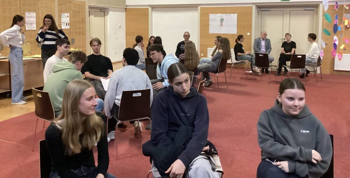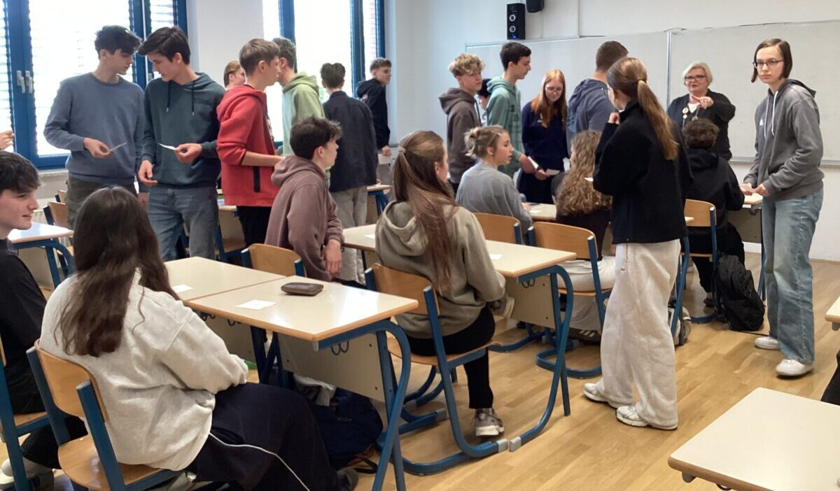 Der Donnerstag begann mit einem gemeinsamen Start an der Schule. Bei Kennenlernspielen kamen deutsche und slowenische Schülerinnen und Schüler schnell miteinander ins Gespräch. Es folgte ein Rundgang durch die Schule, bei dem die Gäste Einblicke in das Schulgebäude, den Tagesablauf und das Schulleben erhielten. In gemischten Gruppen arbeiteten die Jugendlichen anschließend gemeinsam an Projekten zum Thema „Stereotype und Voruteile“, eine Arbeit, die sie schon seit Schuljahresbeginn verfolgen. Die Projektgruppen präsentierten sich gegenseitig ihre Ergebnisse und tauschten sich über gesellschaftliche Themen aus.