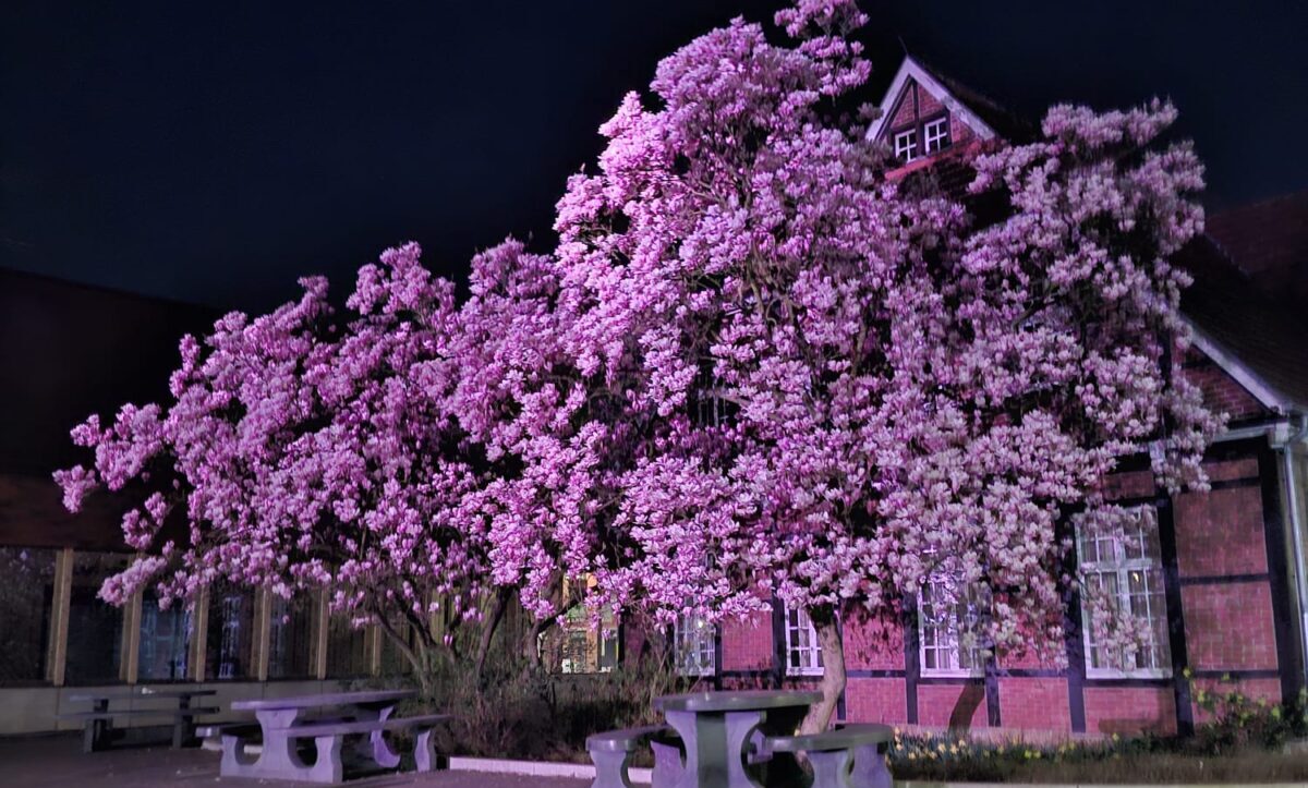 Die Magnolien stehen derzeit am Hof Deitmar in voller Blüte. Dieses Bild hat ein aufmerksamer AllesDetten-Leser beim Abendspaziergang gemacht, – Danke dafür.