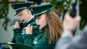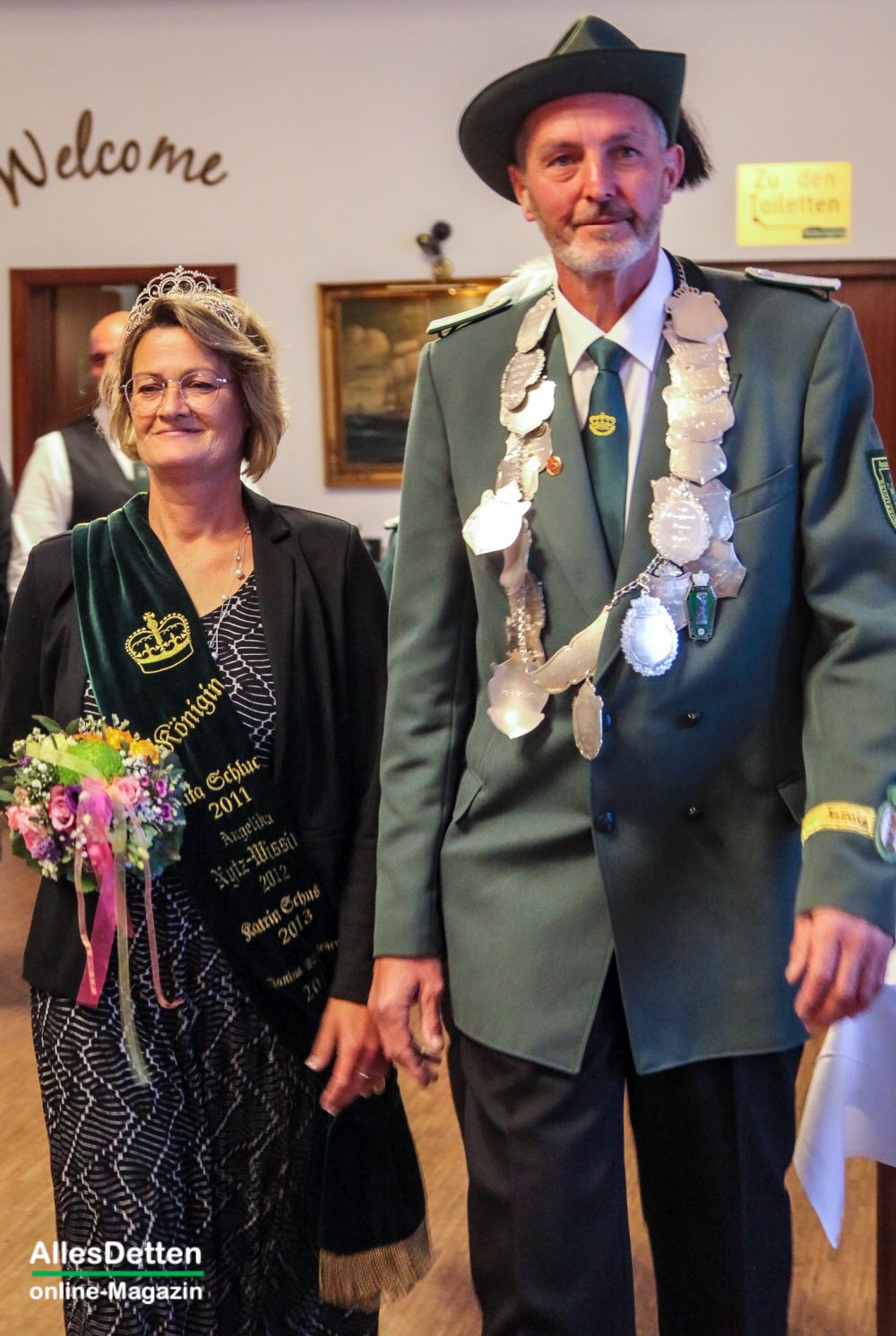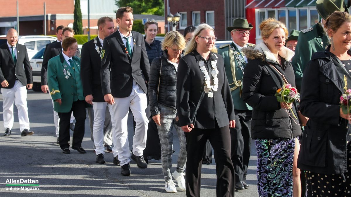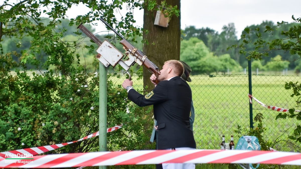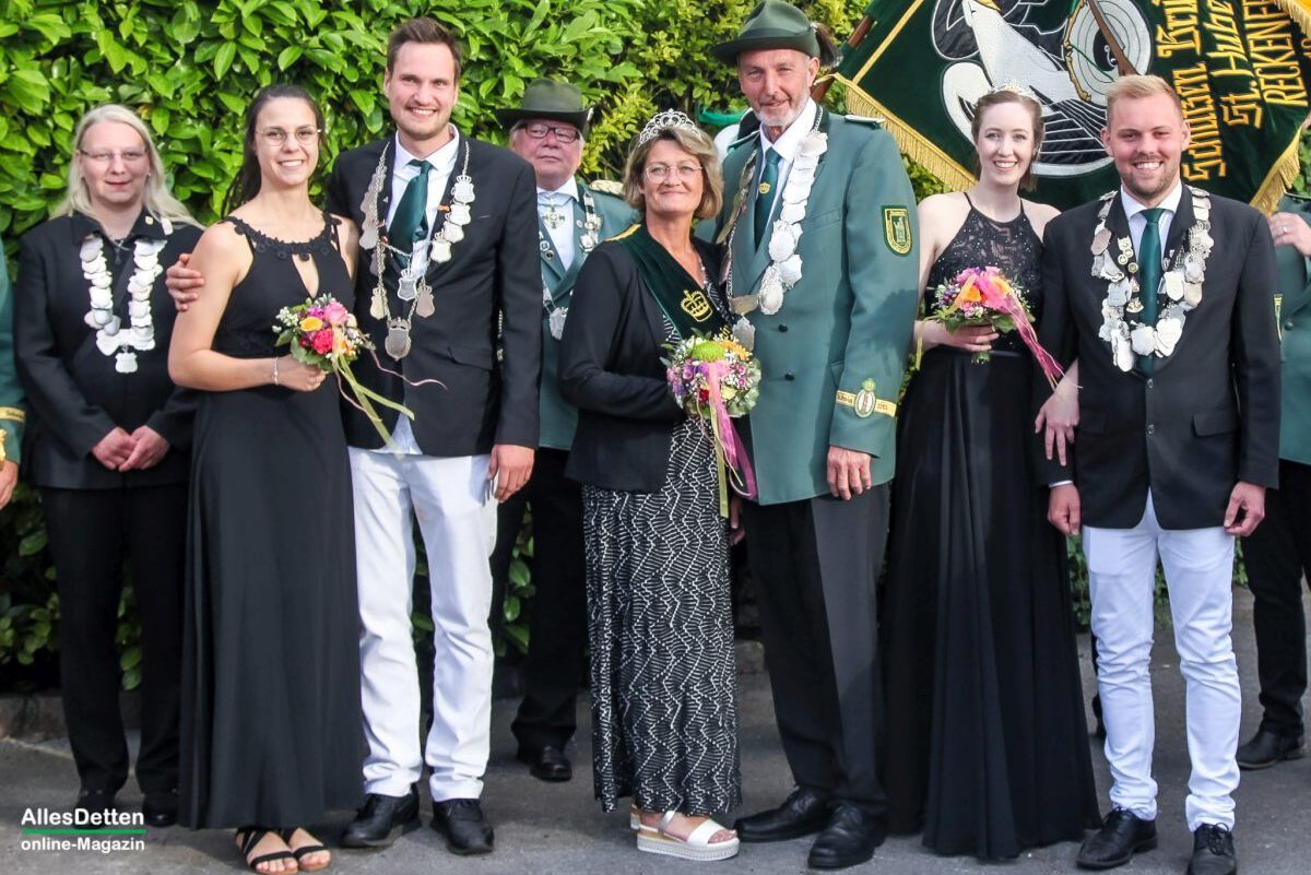 Insgesamt fast 900 Schuss am gestrigen Himmelfahrtstag um einen neuen Jugend- sowie Seniorenkönig zu bekommen und 149 heute zur Ermittlung des Jugendkaisers 2022. Eigentlich sollten gestern die beiden neuen Königspaare schon um 18 Uhr proklamiert und der Öffentlichkeit vorgestellt werden, – doch zu diesem Zeitpunkt gab es noch keine neuen Kettenträger. Bis in den späten Abend hatte es gedauert, die Sonne war längst untergegangen und der Spielmannszug 2008 Bahnhof Greven hatte seine Sachen gepackt, da standen dann beide neuen Regenten fest: Jugendkönig 2022 ist Alexander Dömer mit Königin Vanessa Meyjohann, Seniorenkönig Frank Schwartze mit seiner Frau Sabine Schwartze. Heute gesellte sich dann das Jugendkaiserpaar Rene Wiese und Vanessa Morinaj dazu. Stritzkönigin wurde Viktoria Schwaiberger.