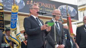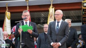 Rainer Müllmann begrüßte die zahlreichen Freunde des Emsdettener Schützenfestes zum 101. Schützenfest unter dem Deckmantel der Vereinigten Schützengesellschaften von Emsdetten im Anschluß an den Gottesdienst zwischen Pankratiuskirche und Rathaus. Auch er brachte seine Freude zum Ausdruck, in so viele freudige Gesichter schauen zu können, – wenngleich die tatsächliche Beteiligung schon mal mehr war, – das wiederum mag damit zusammenhängen, dass mit diesem Wochenende die Sommerferien und somit die Urlaubszeit begonnen hat.