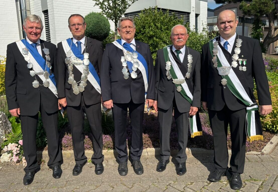 09.15 Uhr Antreten am Festzelt zum Ausholen der Jubelkönige: Michael Overbeck, Andreas Diesen, Konrad Bröker und der Wanderkettenjubilare Markus Heitkemper und Paul Austrup bei Overbecks, Rheiner Str. 204a