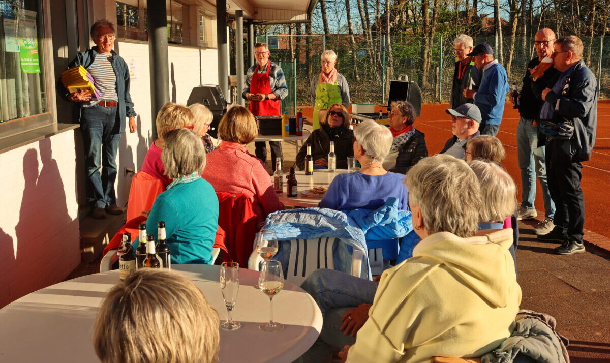 Als alle kulinarisch versorgt waren, bedankte sich die 1. Vorsitzende der Radwanderfreunde Ulrike Hüls-Klespe sehr herzlich bei dem kompletten Vorbereitungsteam mit einem süßen Dankeschön. Auf der sonnenbeschienenen Terrasse des Vereinsheims der Tennisgemeinschaft kamen die Radbegeisterten lebhaft ins Gespräch. Manches Erlebnis und etliche Anekdoten vergangener Touren wurden in Erinnerung gerufen. Der Blick ging ebenso nach vorn mit viel Vorfreude auf die Mehrtagestouren der neuen Saison und die vielen „kleinen“ Touren vor Ort.