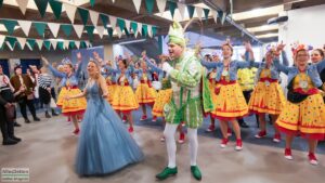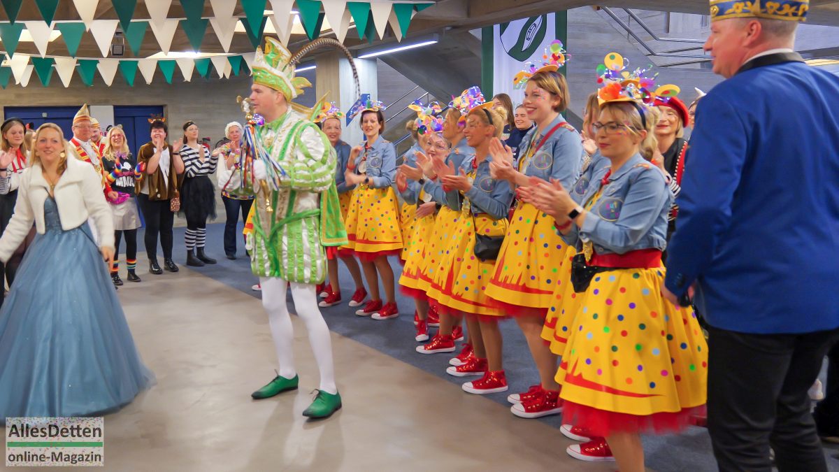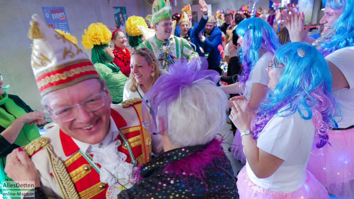 KGE-Präsident Martin Mersmann begrüßte das Dreigestirn der Verwaltungsspitze Bürgermeister Oliver Kellner, 1. Beigeordneten Elmar Leuermann und Technischen Beigeordneten Martin Dörtelmann sowie die Damen der Stadtverwaltung. Kellner begrüßte im Gegenzug Prinzenpaar, Elferrat und KGE-Abordnung. Prinz Tobias gab das Mikro gleich an seine Prinzessin weiter, hatte er doch heute nichts zu sagen und Jessica rief dann gleich das Motto der Session aus: „Bunte Narren überall – so feiert Detten Karneval!“