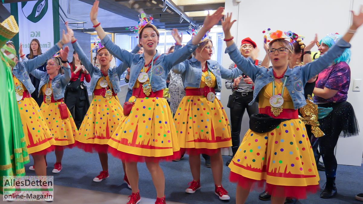 Hier hatten die „Weiber“ der Stadtverwaltung bereits das Büro des Bürgermeisters gestürmt. Im Foyer, da, wo sonst die Ausstellungen stattfinden wurde es dann zunehmend bunter, Aufstellung für ein Gruppenfoto für AllesDetten. Vergessen waren für heute Satzungen, Verfügungen, Anträge, Genehmigungen, Bebauungspläne oder Passverlängerungen.