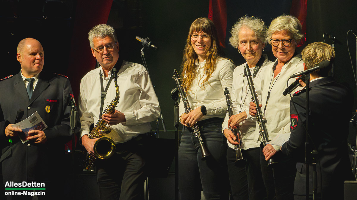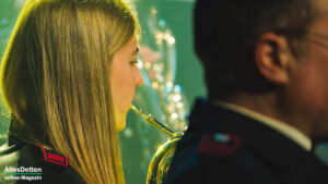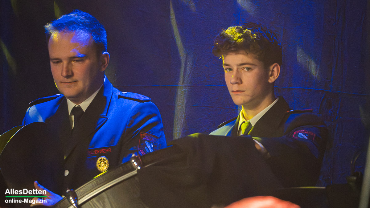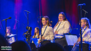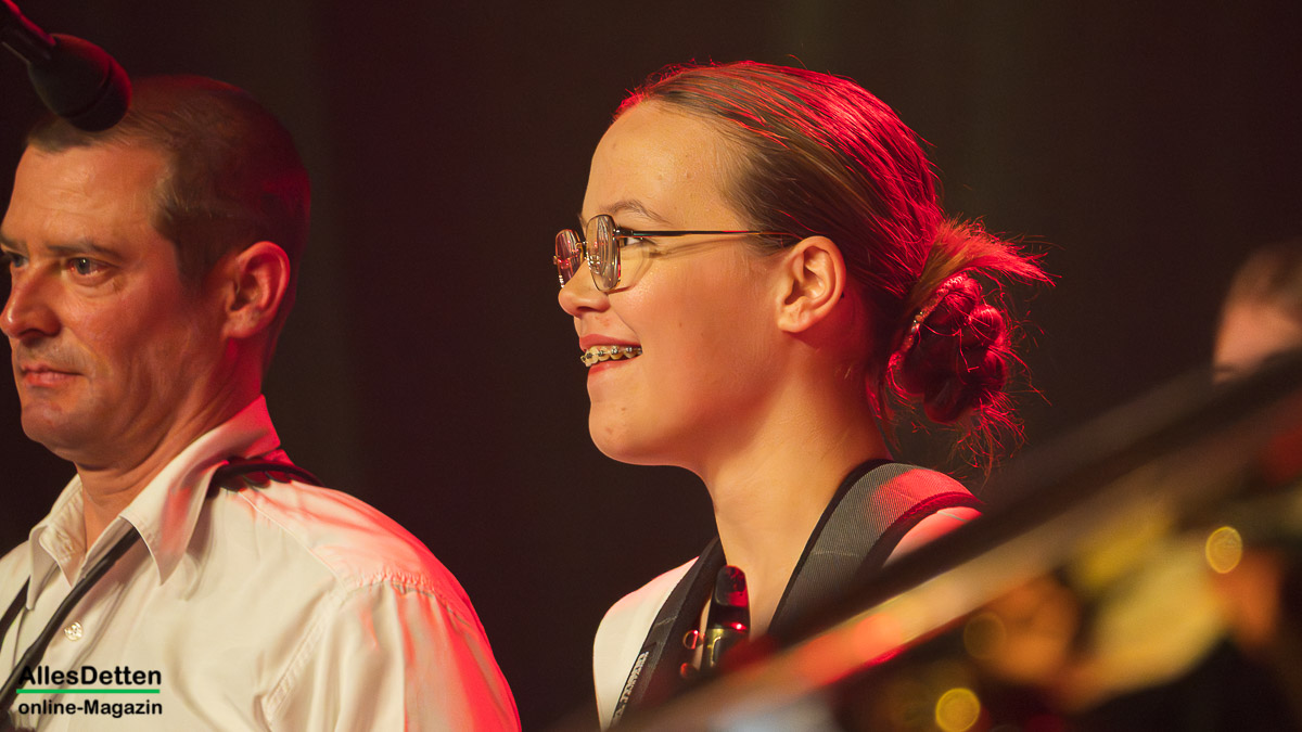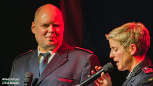 Moderiert wurde der Abend von Heike Austrup und Guido Heitmeier, die gleich zu Beginn verkünden konnten, dass am 01. und 02. Januar 2026 drei Babys aus den Reihen des Musikzuges das Licht der Welt erblickten. Für langfristigen Nachwuchs ist also gesorgt, – womit wir bei einer Herzensangelegenheit der Feuerwehr Emsdetten wären: Die Nachwuchsarbeit im Jugendorchester. Schon traditionell gestalten die Jugendlichen den Auftakt nach der Pause. – Und das taten sie unter der musikalischen Leitung von Lea Börgel (frisch verheiratet, wir hatten sie seinerzeit noch als Lea Krallmann in unserer Serie „AllesDetten zu Gast bei…“ H I E R vorgestellt) und Jana Albers. Sie begannen mit „Havanna„, brachten ein Medley „The best of Queen“ („We will rock u„, „We are the champions„…) und intonierten abschließend das Stadtelferratslied 2026.