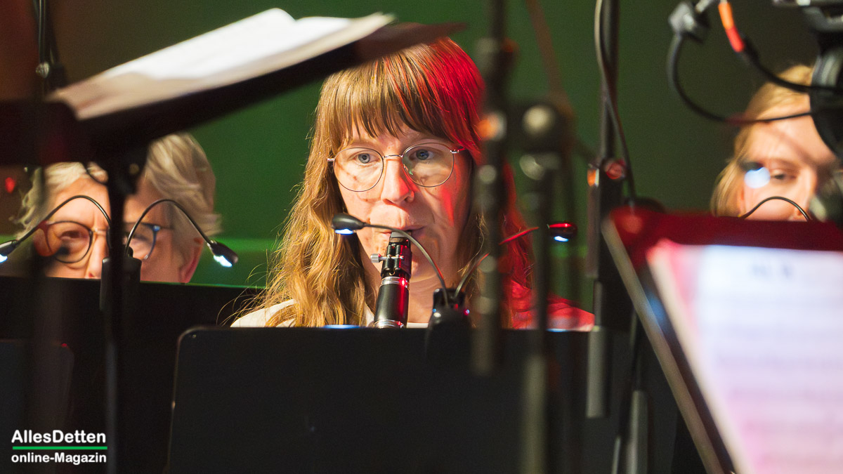 Das von Julian Teltenkötter (den wir seinerzeit H I E R vorgestellt hatten) zusammengestellte Konzert war vielseitig, hier konnte sich jeder abgeholt fühlen und hat ganz bestimmt seinen eigenen musikalischen Höhepunkt gefunden. Für die Einen mag es der spanisch angehauchte Teil gewesen sein, „El Camino Real„, gleich als zweites Stück des abends mit einem ordentlichen „Bummss“ als Schlußtakt, ließ vermuten: das war der Stein, der Musikern und Dirigent vom Herzen fiel, – ein anspruchsvolles Stück, temperamentvoll und engagiert vorgetragen. „Lehnen Sie sich zurück und wippen heimlich mit den Füßen.“ lautete der Vorschlag der Moderation – eine gute Idee.