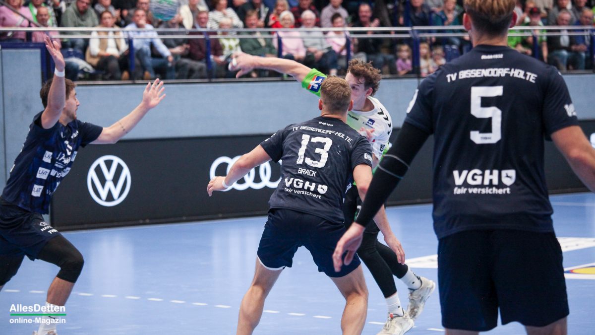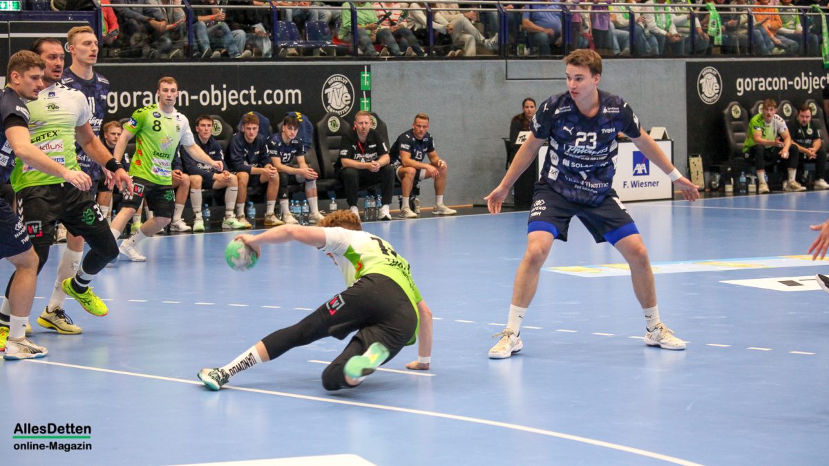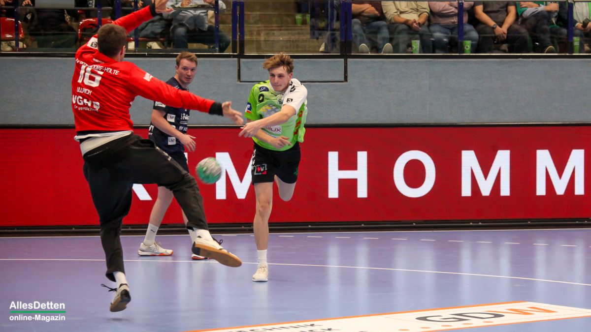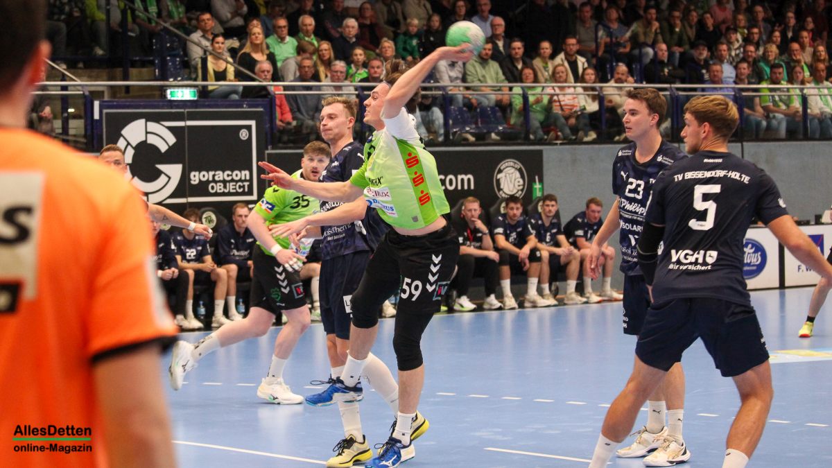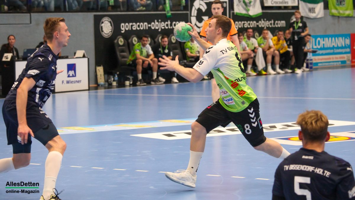 Für die Gäste des TV Bissendorf-Holte war die Aufgabe beim Gastspiel in Emsdetten klar. Die Partie so lange wie möglich offen halten. Und dann mal schauen was der TVE so anbietet. Und in der Anfangsphase klappte das noch ganz gut, da unsere Handballer im Angriff so einiges liegen ließen. Nach knapp sechs Spielminuten war erst ein Emsdettener Tor auf der Anzeigetafel zu sehen, ehe Fynn Hasenkamp zum 2:2 ausgleichen konnte. Es fehlte ein wenig der Schwung und die Präzision, mit der unsere Tormaschine sonst so gern den Gegner überrumpelt. Nach neun gespielten Minuten ging der Gast sogar mit zwei Toren in Führung. 3:5 aus Dettener Sicht war so wohl nicht eingeplant. Trainer Lennart Lingener ließ unser Team einfach mal machen, hatte Vertrauen und zog die erste Auszeit erst nach fast 20 gespielten Minuten. Hier hatten seine Schützlinge die Partie schon auf eine eigene zwei Tore Führung gedreht, konnten einen 11:9 Zwischenstand anschreiben.