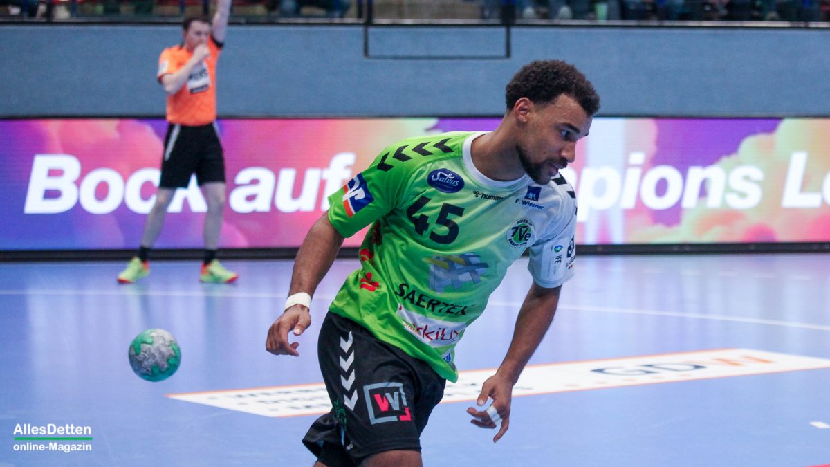Die letzten zehn Spielminuten des ersten Durchgangs durften die Emsdettener Handballfans dann den TVE Express in Aktion sehen. Insbesondere Oliver Krechel im Tor zeigte eine beeindruckende Leistung. Er nahm dem Gegner im Zusammenspiel mit seinen Vorderleuten immer wieder Chancen und wehrte Bälle ab. Von da ging es dann lang und weit auf unsere flinken Außenbahnspieler Eric Damböck und Yannick Terhaer. Sieben von acht Emsdettener Toren in diesen zehn Minuten gingen auf das Konto der beiden Turbohandballer. Vorlagengeber war oft Oliver Krechel selbst, der den Ball lang und weit auf die beiden Sprinter spielte. Die bedankten sich mit sicher verwandelten Gegenstößen. Ganz zur Freude der Fans, die es jetzt so richtig aus den Sitzen hob.