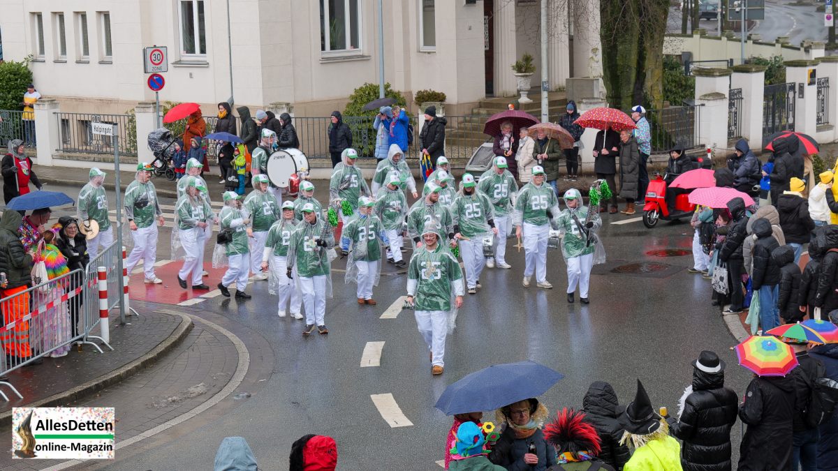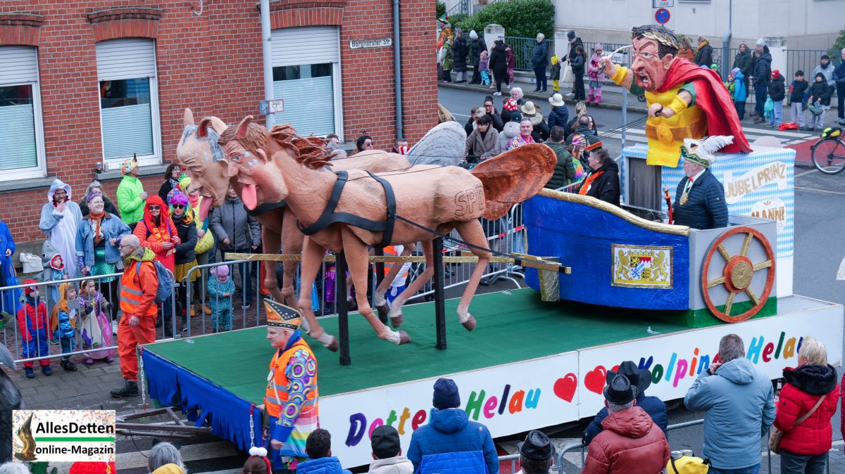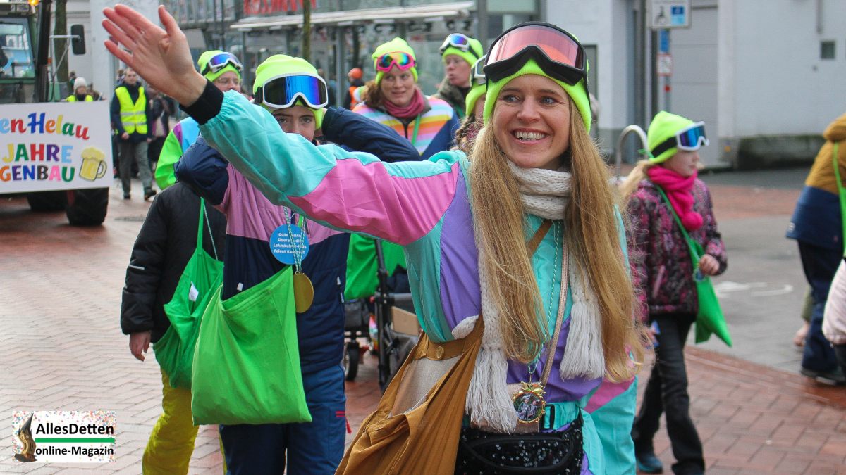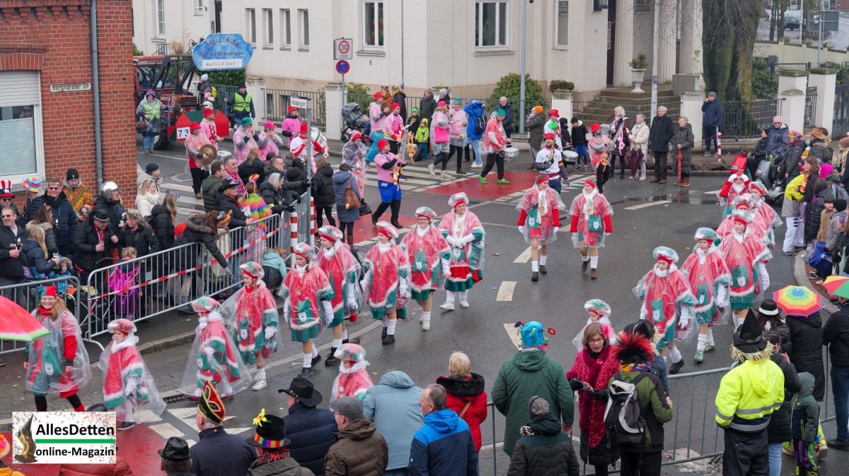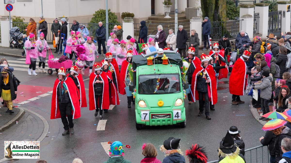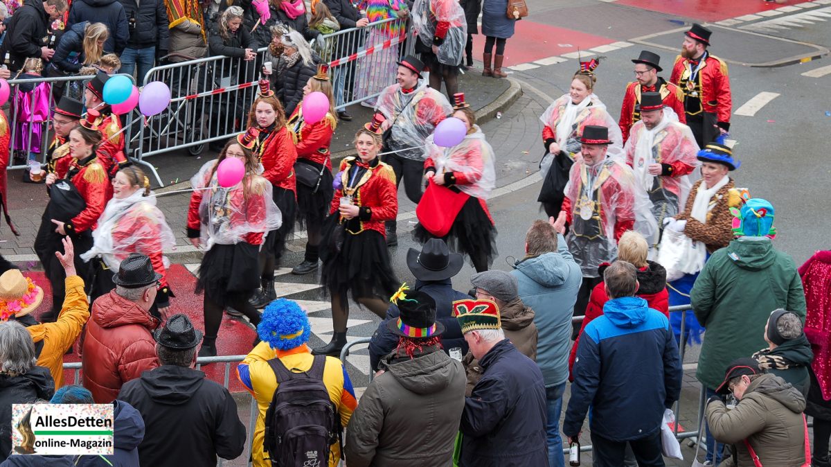 Strahlender Sonnenschein, blauer Himmel in den Mittagsstunden des Rosenmontags machten so richtig Laune auf den Umzug. Mit jedem Meter den der Zug dann pünktlich ab 14:11 Uhr sich fortbewegte, wurde es leider grauer und kälter. Um kurz nach 15 Uhr wurde es gar kurzzeitig etwas stürmisch und regnerisch. Es war der Moment, als das Kinderprinzenpaar der Hagelisten, die mit dem nachgebauten Leiterwagen der Feuerwehr ganz hoch hinaus wollten, gerade durch den Berkemeyer-Kreisel gefahren ist, vor dem Balkon bei Düsterbeck stand, von dem aus AllesDetten eine Vielzahl der heutigen Bilder gemacht hat. Von da an wurden die bunten Kostüme häufig von Regencapes verdeckt. Diese waren zwar in aller Regel transparent, machten aber die eigentliche Wirkung der häufig phantasievollen Kostüme kaputt.