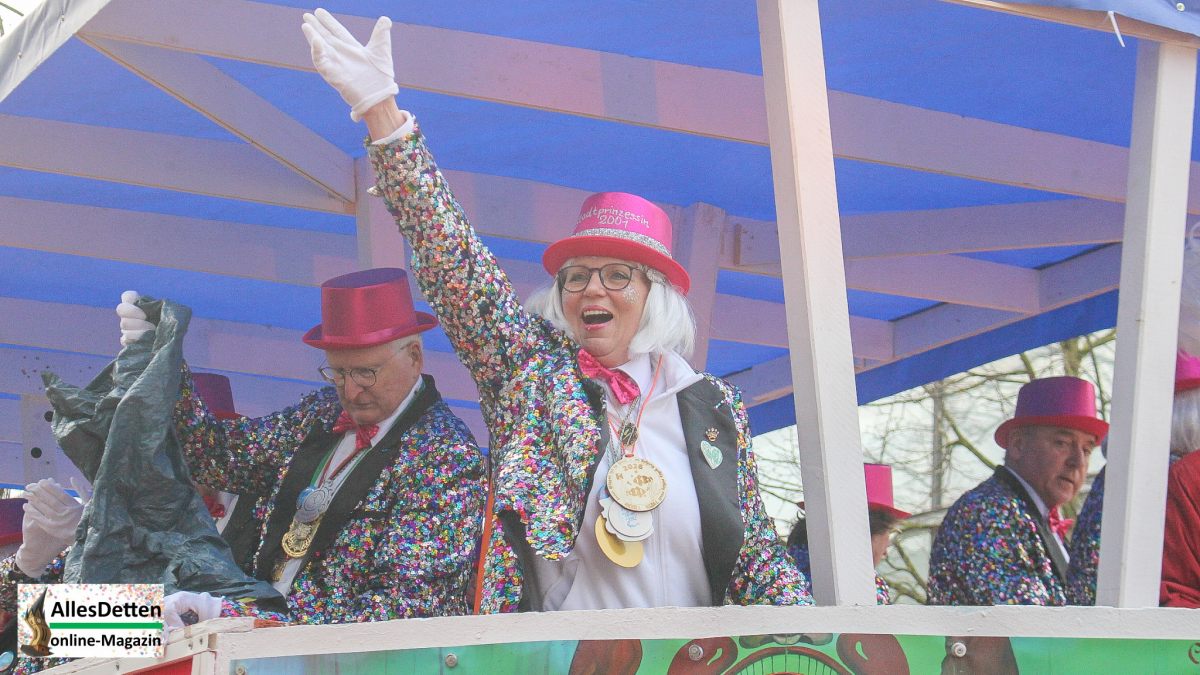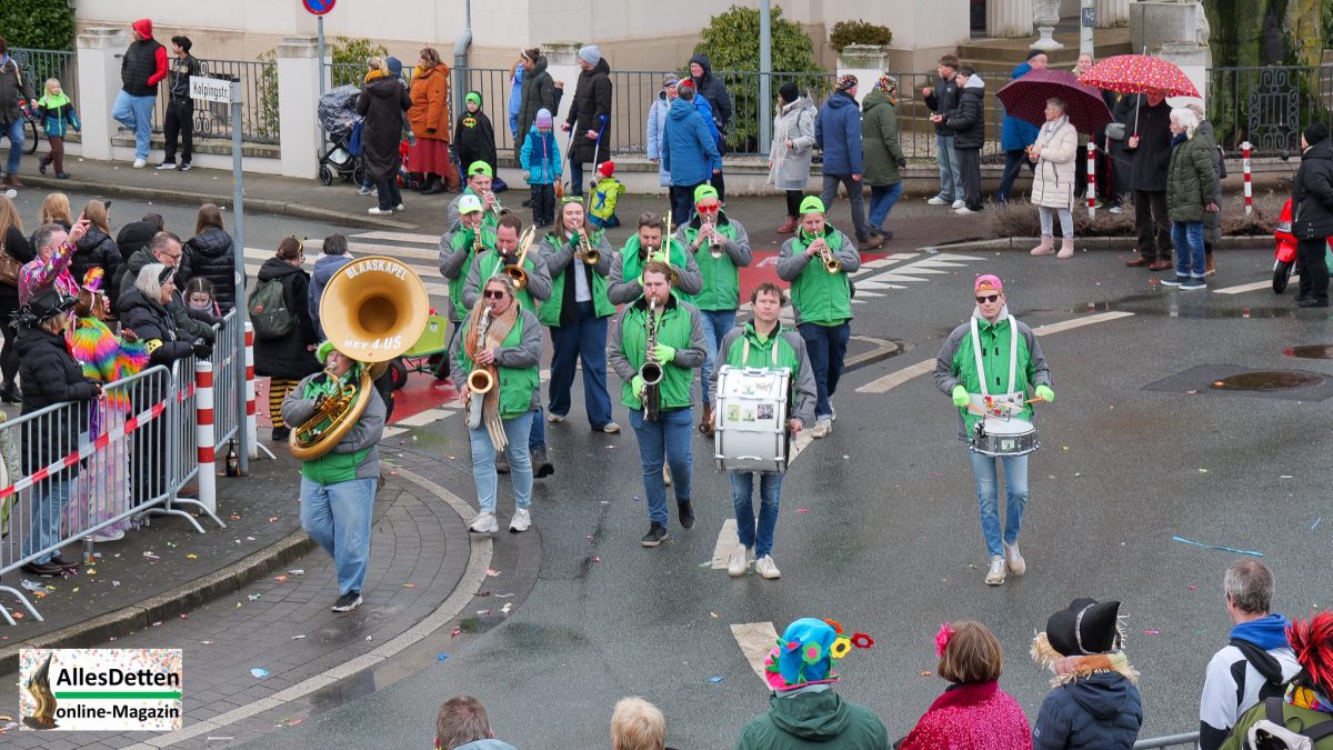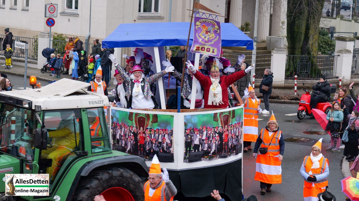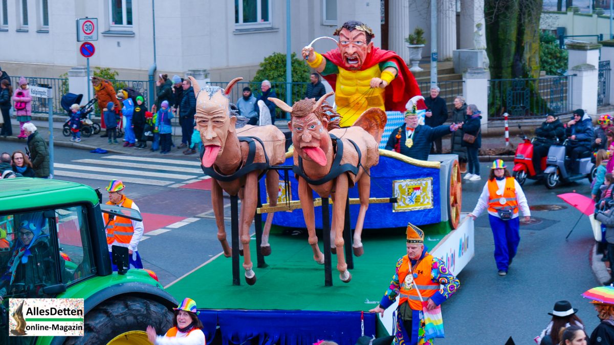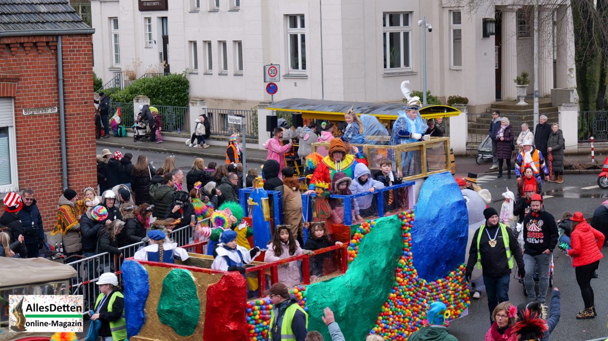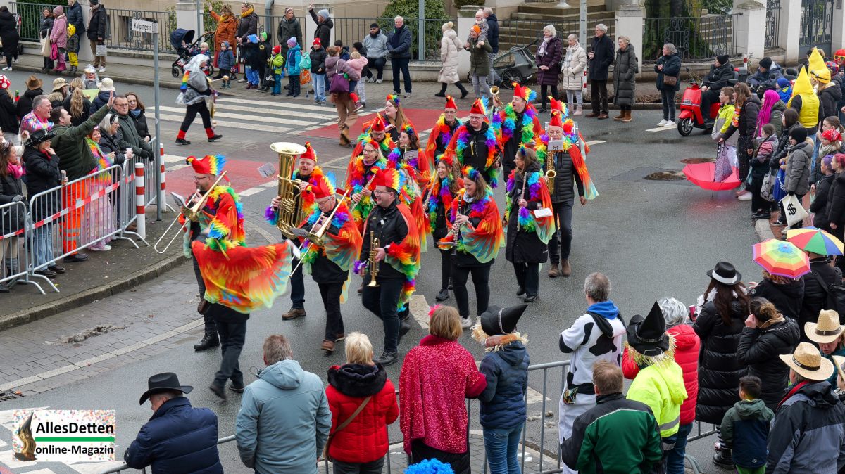Strahlender Sonnenschein, blauer Himmel in den Mittagsstunden des Rosenmontags machten so richtig Laune auf den Umzug. Mit jedem Meter den der Zug dann pünktlich ab 14:11 Uhr sich fortbewegte, wurde es leider grauer und kälter. Um kurz nach 15 Uhr wurde es gar kurzzeitig etwas stürmisch und regnerisch. Es war der Moment, als das Kinderprinzenpaar der Hagelisten, die mit dem nachgebauten Leiterwagen der Feuerwehr ganz hoch hinaus wollten, gerade durch den Berkemeyer-Kreisel gefahren ist, vor dem Balkon bei Düsterbeck stand, von dem aus AllesDetten eine Vielzahl der heutigen Bilder gemacht hat. Von da an wurden die bunten Kostüme häufig von Regencapes verdeckt. Diese waren zwar in aller Regel transparent, machten aber die eigentliche Wirkung der häufig phantasievollen Kostüme kaputt.