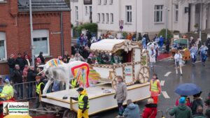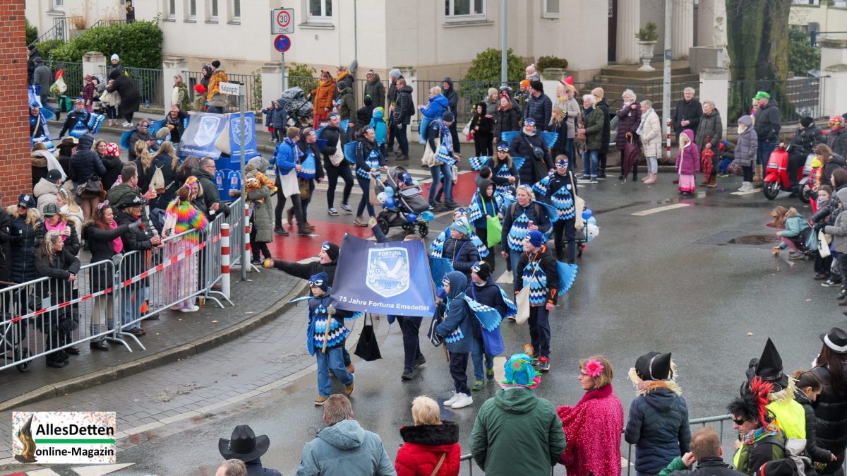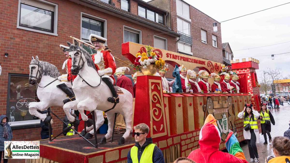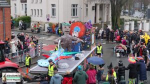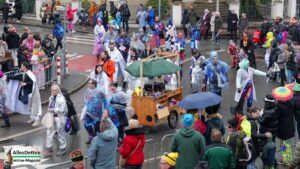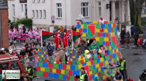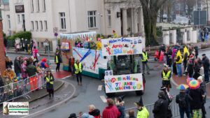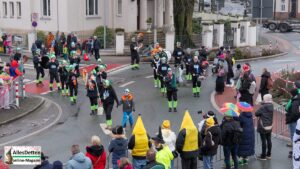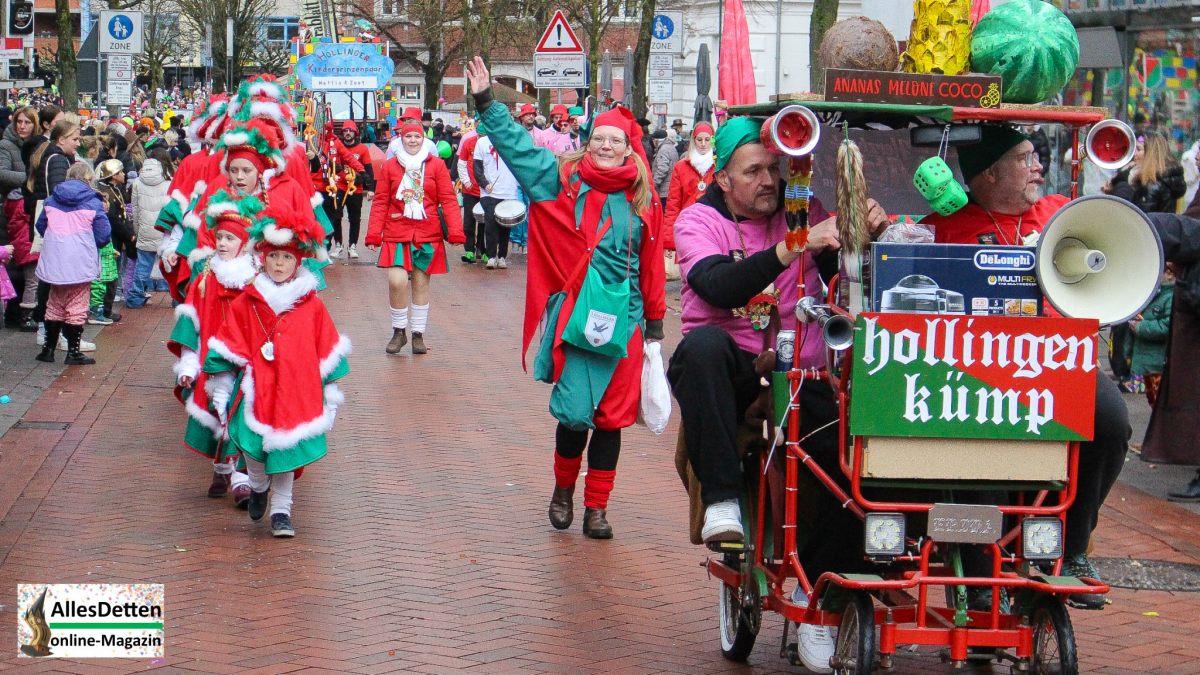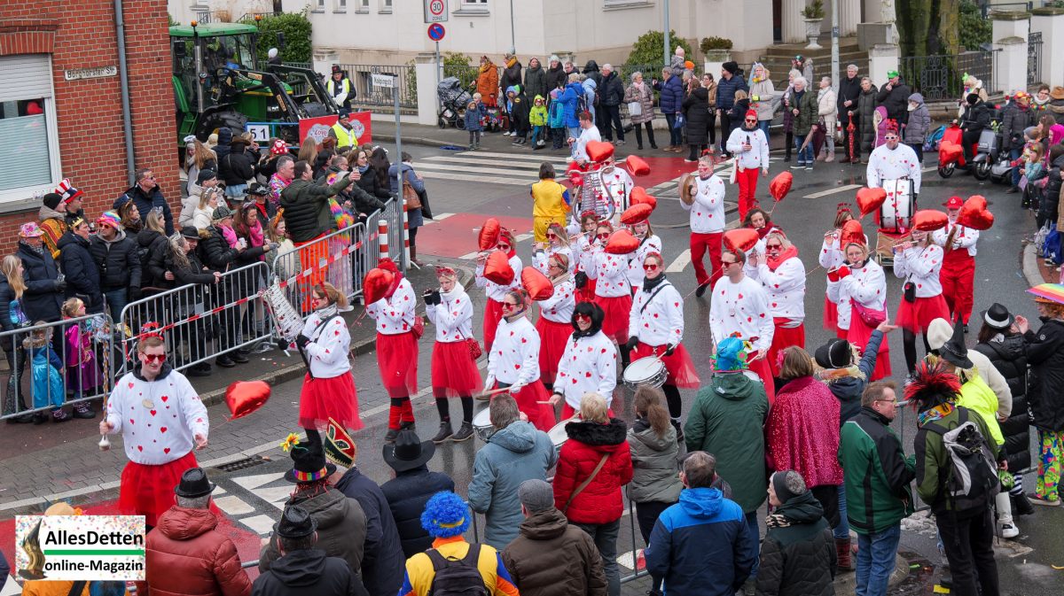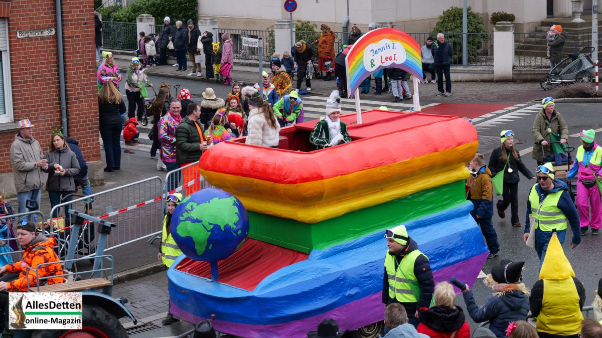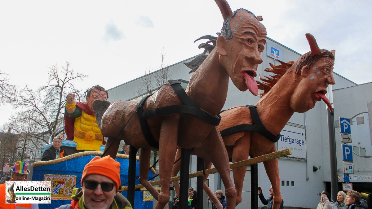 Strahlender Sonnenschein, blauer Himmel in den Mittagsstunden des Rosenmontags machten so richtig Laune auf den Umzug. Mit jedem Meter den der Zug dann pünktlich ab 14:11 Uhr sich fortbewegte, wurde es leider grauer und kälter. Um kurz nach 15 Uhr wurde es gar kurzzeitig etwas stürmisch und regnerisch. Es war der Moment, als das Kinderprinzenpaar der Hagelisten, die mit dem nachgebauten Leiterwagen der Feuerwehr ganz hoch hinaus wollten, gerade durch den Berkemeyer-Kreisel gefahren ist, vor dem Balkon bei Düsterbeck stand, von dem aus AllesDetten eine Vielzahl der heutigen Bilder gemacht hat. Von da an wurden die bunten Kostüme häufig von Regencapes verdeckt. Diese waren zwar in aller Regel transparent, machten aber die eigentliche Wirkung der häufig phantasievollen Kostüme kaputt.