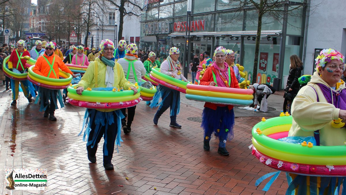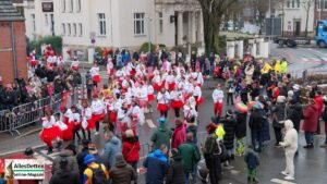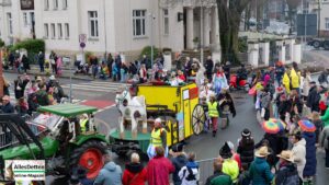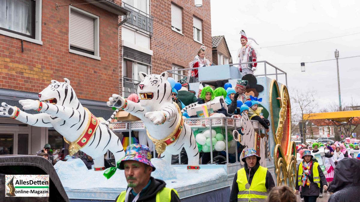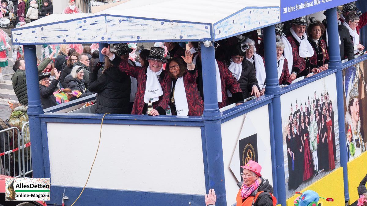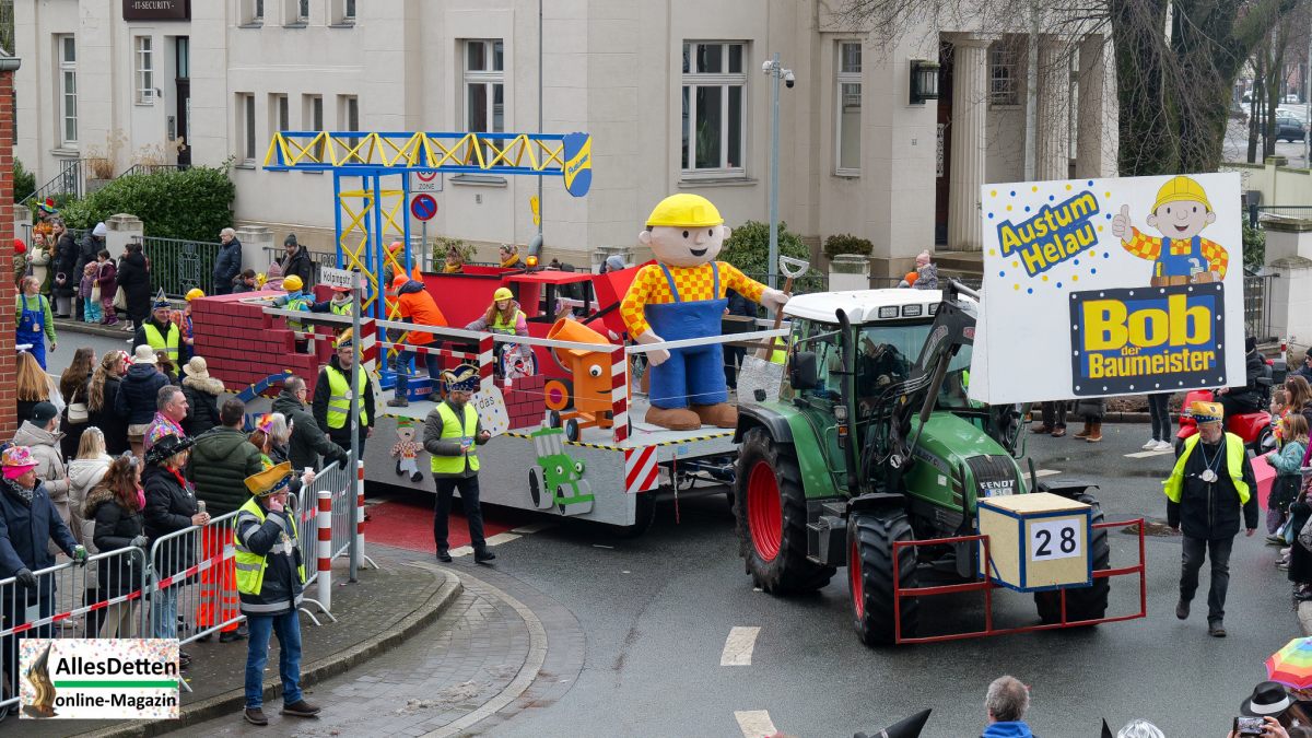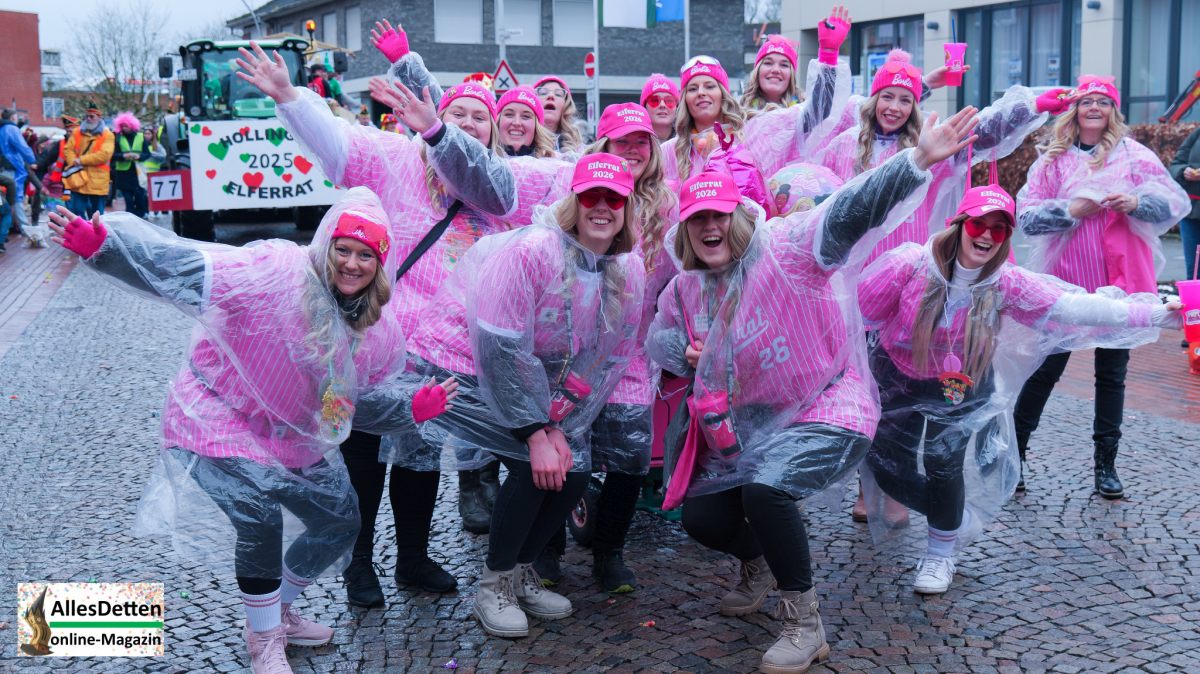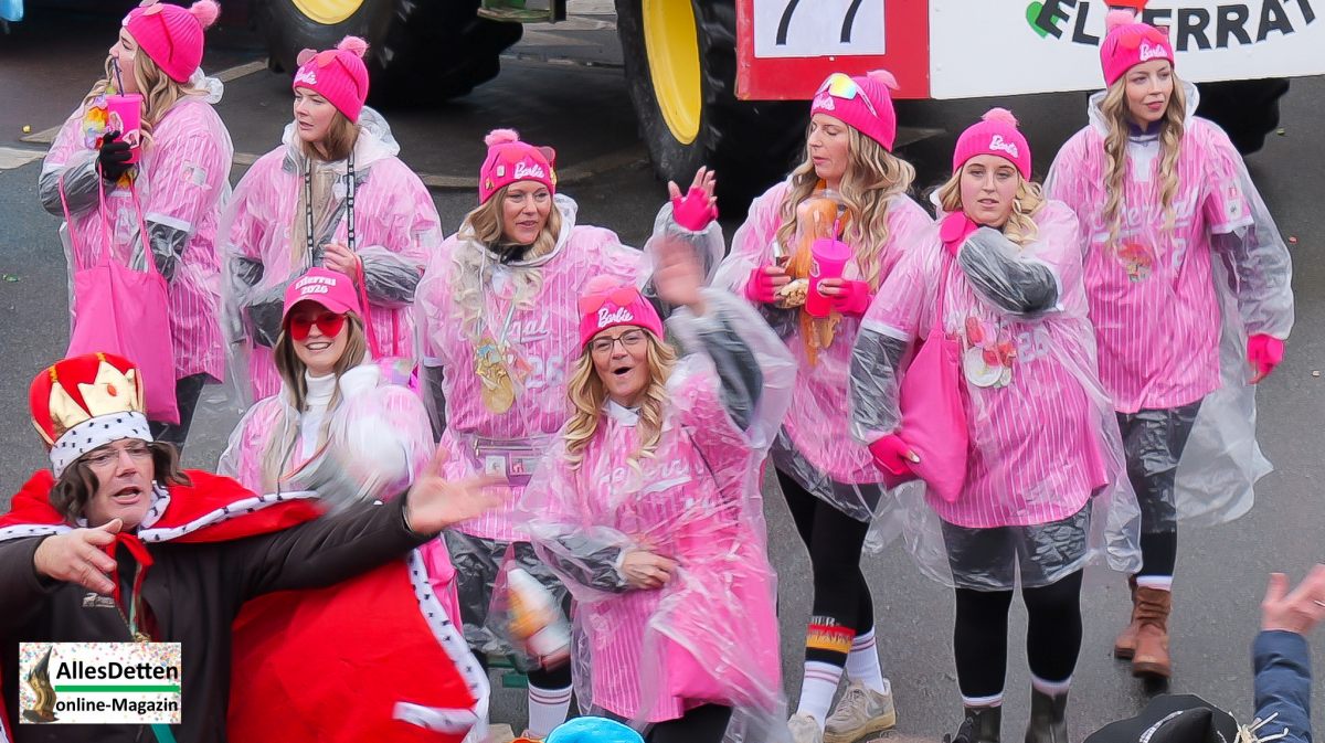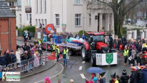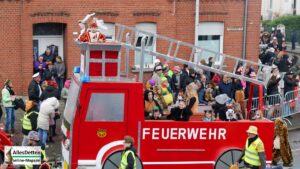 Strahlender Sonnenschein, blauer Himmel in den Mittagsstunden des Rosenmontags machten so richtig Laune auf den Umzug. Mit jedem Meter den der Zug dann pünktlich ab 14:11 Uhr sich fortbewegte, wurde es leider grauer und kälter. Um kurz nach 15 Uhr wurde es gar kurzzeitig etwas stürmisch und regnerisch. Es war der Moment, als das Kinderprinzenpaar der Hagelisten, die mit dem nachgebauten Leiterwagen der Feuerwehr ganz hoch hinaus wollten, gerade durch den Berkemeyer-Kreisel gefahren ist, vor dem Balkon bei Düsterbeck stand, von dem aus AllesDetten eine Vielzahl der heutigen Bilder gemacht hat. Von da an wurden die bunten Kostüme häufig von Regencapes verdeckt. Diese waren zwar in aller Regel transparent, machten aber die eigentliche Wirkung der häufig phantasievollen Kostüme kaputt.