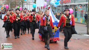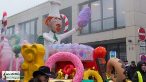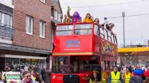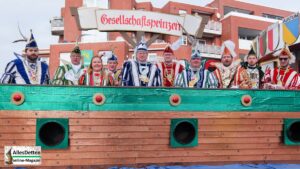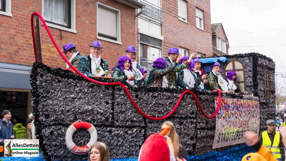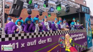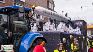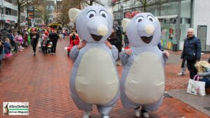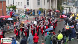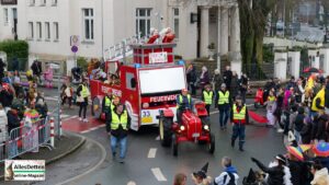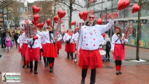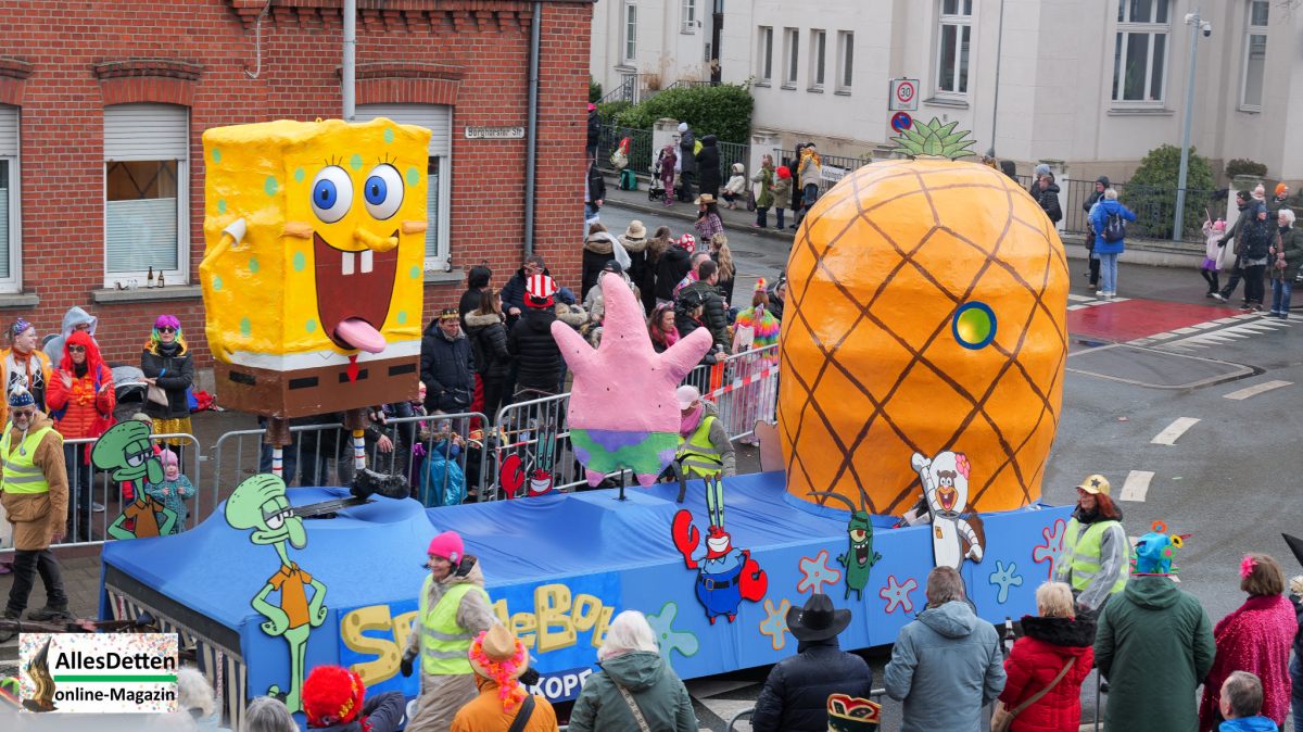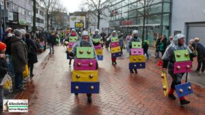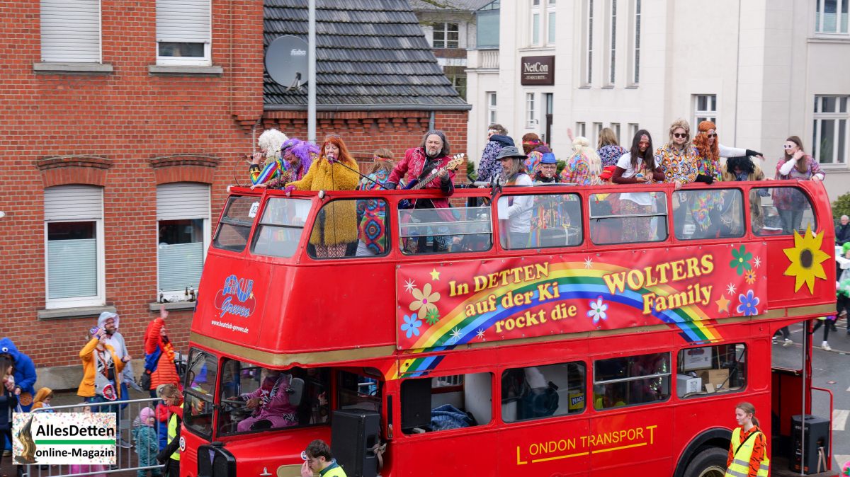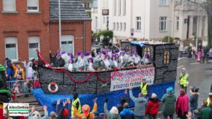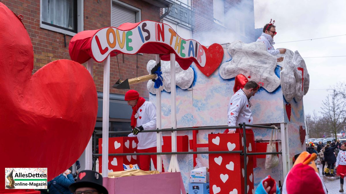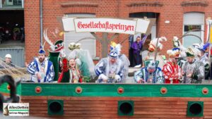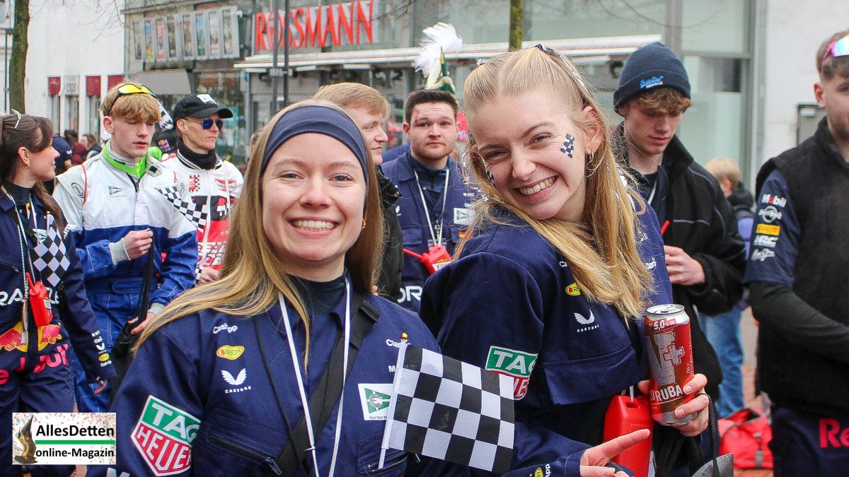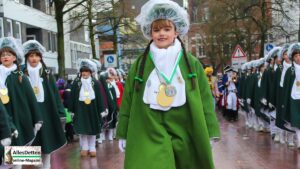 Strahlender Sonnenschein, blauer Himmel in den Mittagsstunden des Rosenmontags machten so richtig Laune auf den Umzug. Mit jedem Meter den der Zug dann pünktlich ab 14:11 Uhr sich fortbewegte, wurde es leider grauer und kälter. Um kurz nach 15 Uhr wurde es gar kurzzeitig etwas stürmisch und regnerisch. Es war der Moment, als das Kinderprinzenpaar der Hagelisten, die mit dem nachgebauten Leiterwagen der Feuerwehr ganz hoch hinaus wollten, gerade durch den Berkemeyer-Kreisel gefahren ist, vor dem Balkon bei Düsterbeck stand, von dem aus AllesDetten eine Vielzahl der heutigen Bilder gemacht hat. Von da an wurden die bunten Kostüme häufig von Regencapes verdeckt. Diese waren zwar in aller Regel transparent, machten aber die eigentliche Wirkung der häufig phantasievollen Kostüme kaputt.