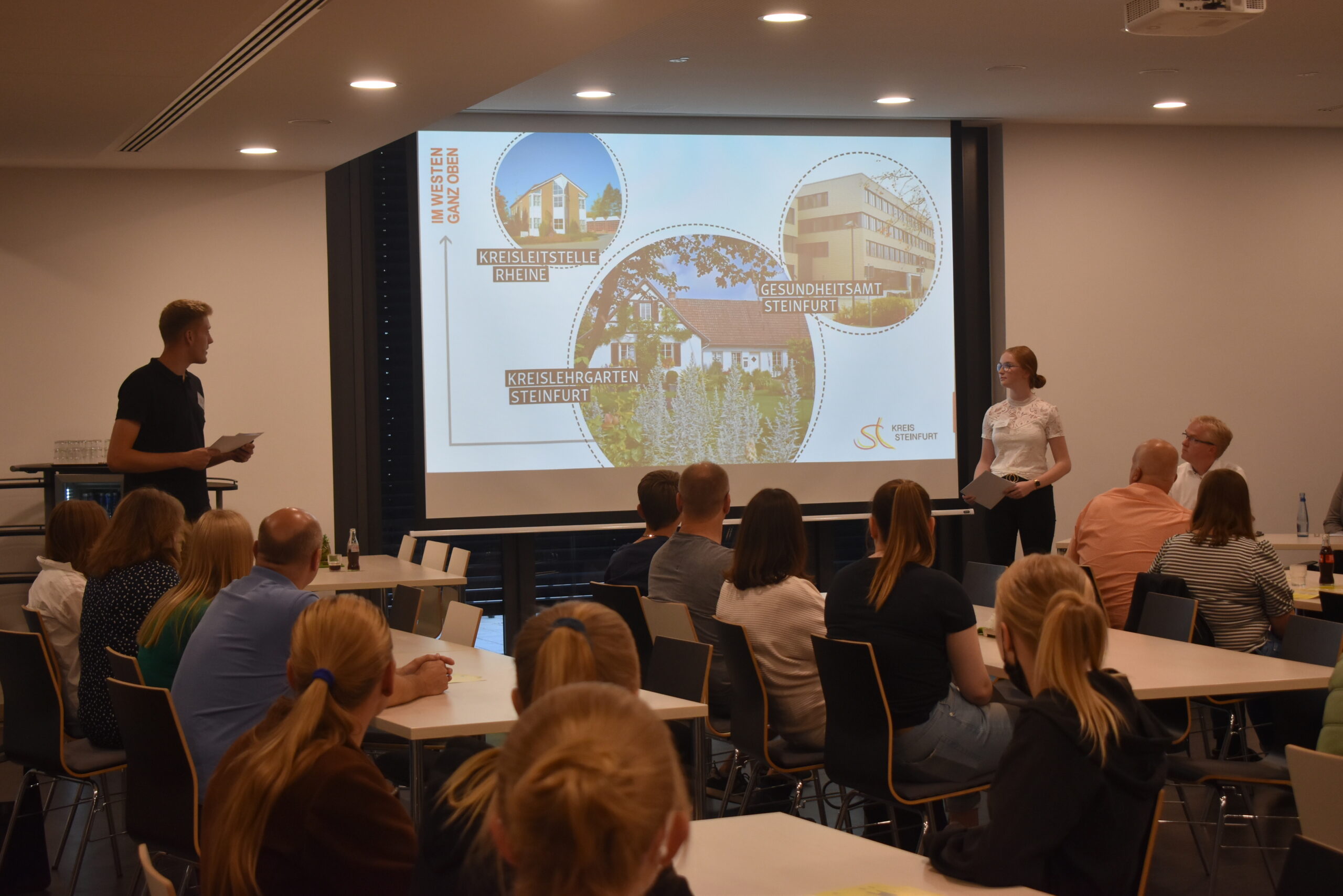 Nach seiner Begrüßung berichtete Haupt- und Personalamtsleiter Thomas Ostholthoff über die Vielfältigkeit der Ausbildung beim Kreis Steinfurt: „Unsere Auszubildenden bekommen einen Einblick in verschiedene Bereiche. Die Ausbildung ist dadurch sehr abwechslungsreich.“ Einen Überblick über die einzelnen Ausbildungsberufe und Angebote zur Fortbildung gab Anna Naber, Ansprechpartnerin für den Bereich Aus- und Fortbildung im Haupt- und Personalamt. Die Auszubildenden Lisa Wietheger und Max Sunke, haben über die Aufgaben der Kreisverwaltung gesprochen und die Veranstaltung moderiert. Informationen aus erster Hand gab es bei der abschließenden Gesprächsrunde. Hier hatten die Teilnehmerinnen und Teilnehmer Gelegenheit sich mit Auszubildenden der jeweiligen Ausbildungsberufe auszutauschen.