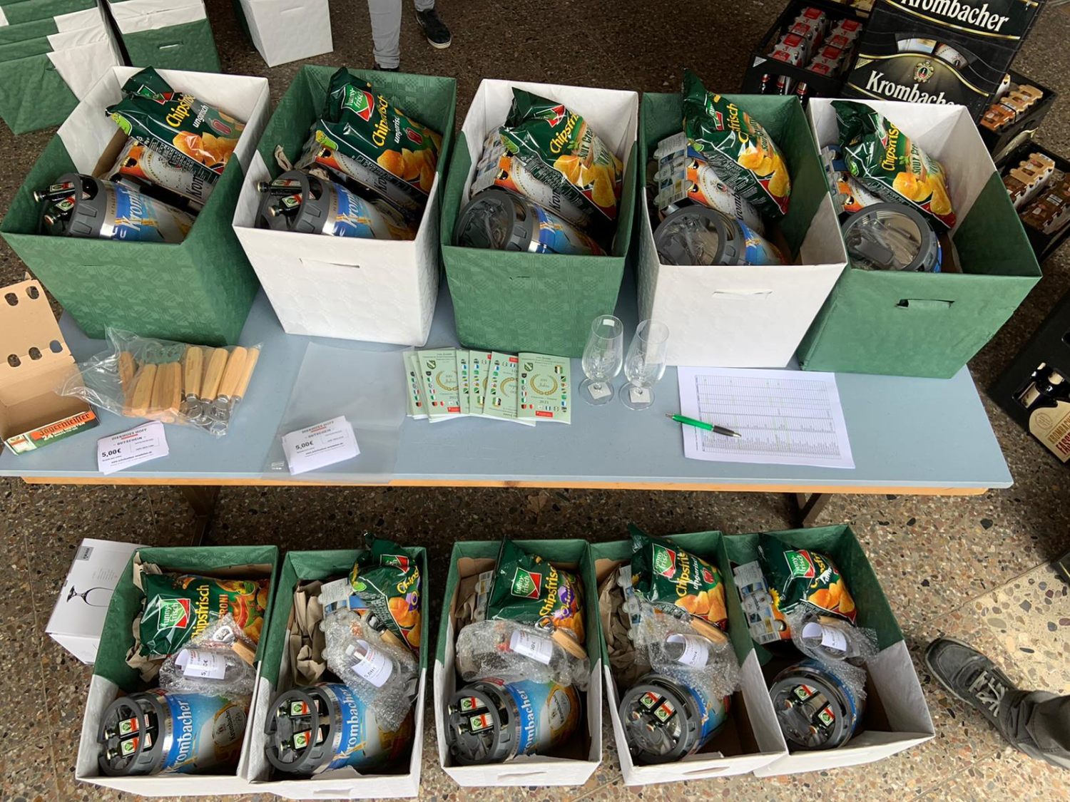 Und wie soll es verpackt werden? Da hatte Silvia, die bessere Hälfte des ersten Vorsitzenden die glänzende Idee. Ein Karton, den man in den Vereinsfarben grün-weiß auslegt, sollte es sein. Bekanntermaßen haben gute Ideen aber oft ein Problem. Sie kosten viel Arbeit und genauso viel Zeit.