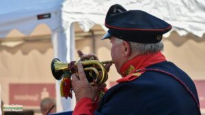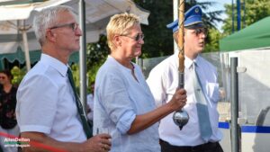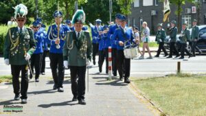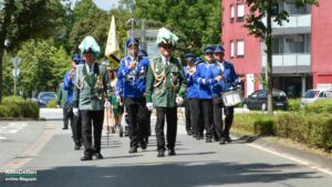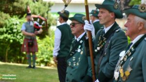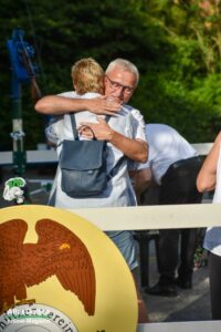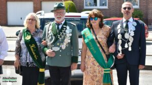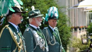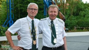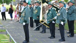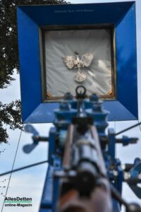 … ein ungewollter Königsschuss führte dazu, dass der Vogel wieder auf die Stange gesetzt wurde. So heißt es offiziell, tatsächlich wurde nur ein Flügel wieder angebracht, der Korpus vom hölzernen Aar hatte dann doch reichlich gelitten. Dieser Flügel erwies sich dann aber als besonders zäh, so dass die Reckenfelder Schützen den Kasten erneut herabließen, den Flügel so präparierten, dass er dann doch in absehbarer Schusszahl fällt.