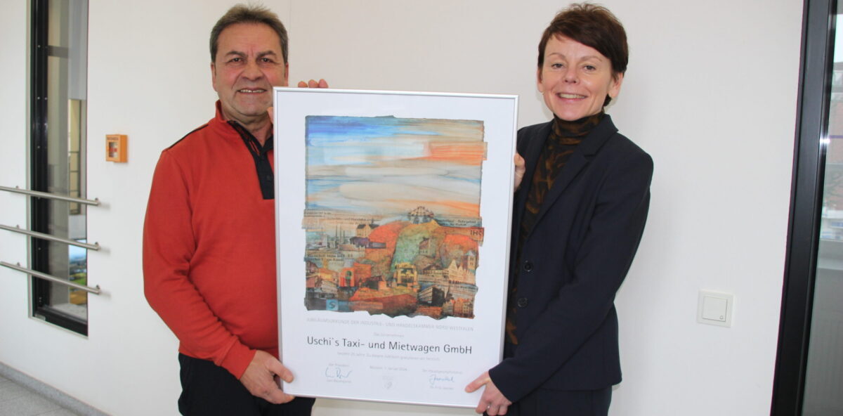 25 Jahre „Uschis Taxi“ war für Inna Gabler Anlass, Inhaber Orhan Toylular zu diesem Jubiläum persönlich zu gratulieren. Die Regionalbeauftragte der Industrie- und Handelskammer für die Kreise Steinfurt und Warendorf machte erstmals einen Stopp im ersten Stock des Bahnhofsgebäudes, wo auch „Taxi Barenkamp“, das älteste Emsdettener Taxiunternehmen seine Zentrale hat. Schon seit vielen Jahren gehört es Kasim Toylular, dem jüngeren Bruder von Orhan.