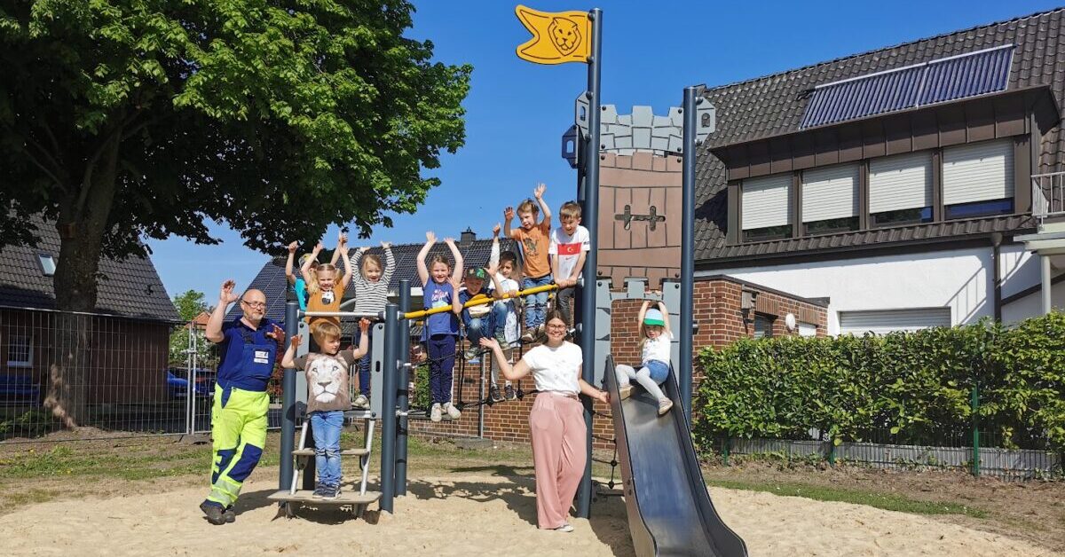 Schon seit dem Sommer 2024 haben sich die Kinder der Kita Herz Jesu mit der Neugestaltung des Spielplatzes in der Nähe ihrer Einrichtung beschäftigt. Bei einem Vor-Ort-Termin gaben die „kleinen Expertinnen und Experten“ ihre Wünsche an Lea Sundermann (Landschaftsplanerin der Stadt Emsdetten) sowie Lisa Bohle (Jugendamt der Stadt Emsdetten) weiter. Viele Wünsche konnten berücksichtigt werden. Der Spielplatz weiß nun mit einer Wackelkutsche, einer Nestschaukel, besonders wackeligen Balancierbalken und einem größeren Spielgerät im Burgdesign zu überzeugen. Ebenso blieben die geliebten Turnstangen erhalten.