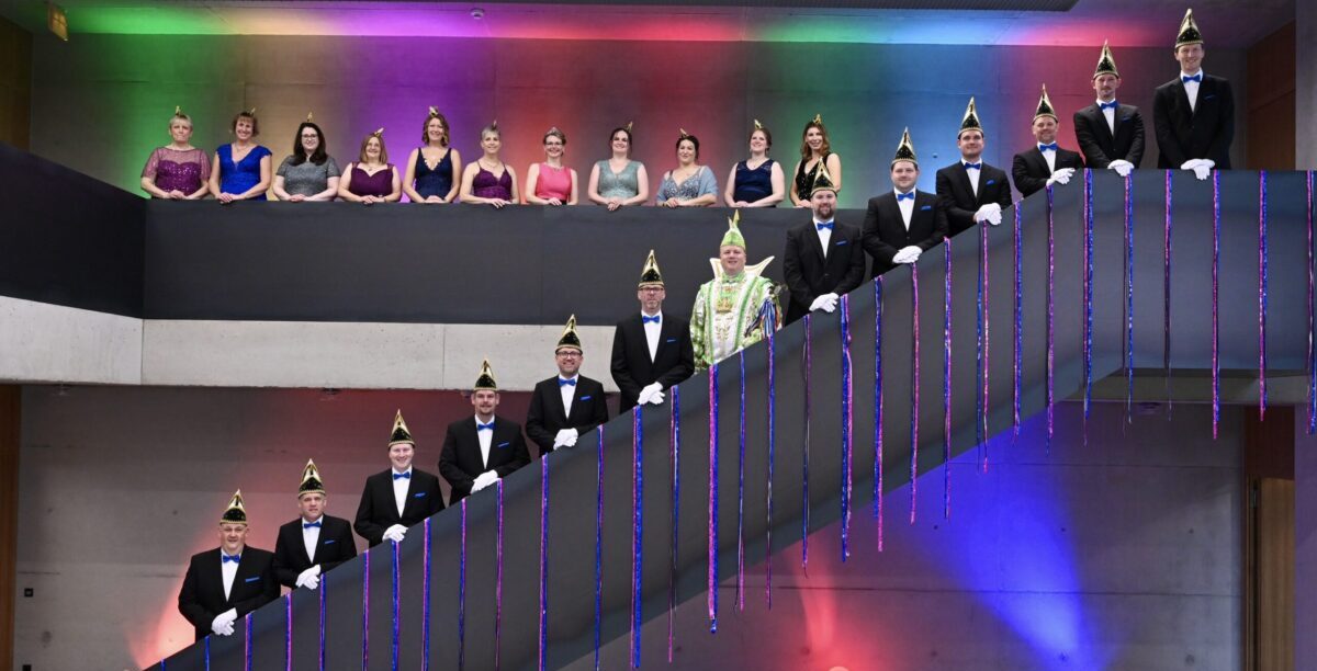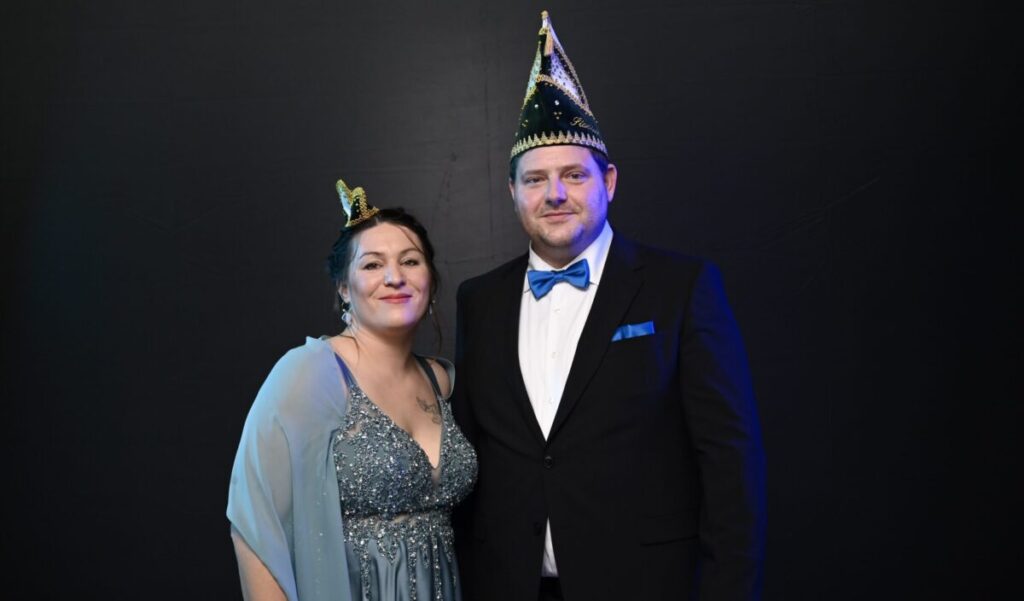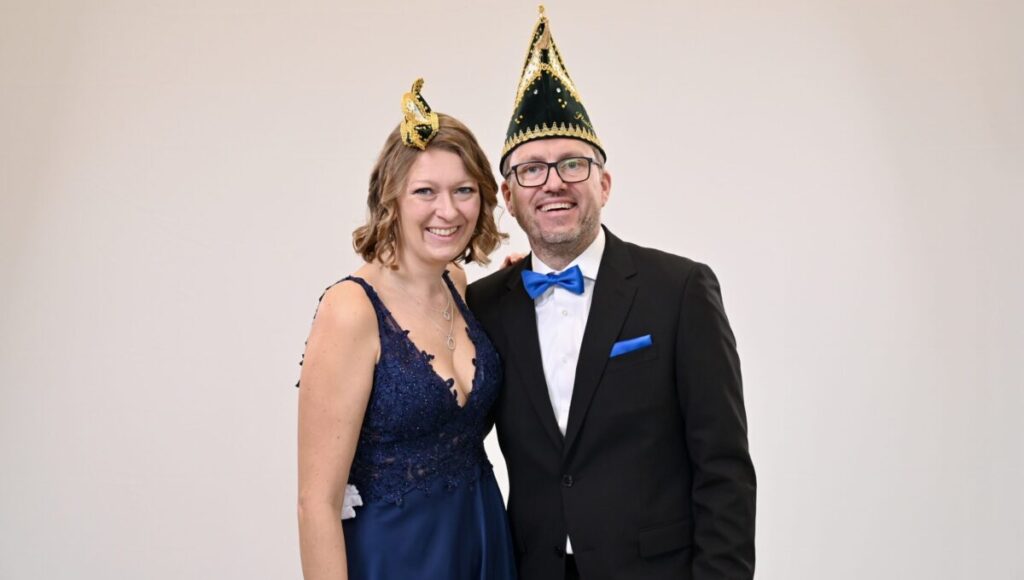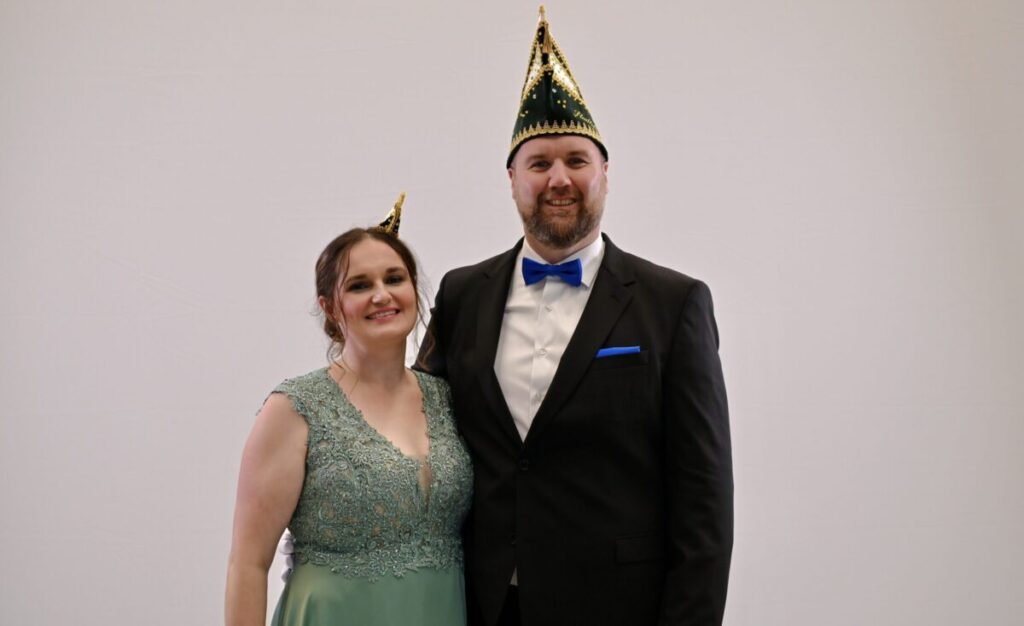 Beate Dawid (46) und Tim Sauerwald (46) formen ein harmonisches Duo im Ministerium für Frohsinnsverteidigung und Heiterkeitsstrategien. In ihrem quirligen Haushalt mit Tochter, Hund und meist vier Generationen, gestalten sie eine lebendige Geschichte im Herzen des Karnevals. Beate, die Wirtschaftsjuristin, bringt sowohl juristische Expertise in die wilde Ehe ein als auch eine ausgeprägte Leidenschaft für Musik, Politik, Reisen, Tennis und Hamburg. Aktiv in der Lokalpolitik von Dottland, kennt sie neben dem Rathaus auch die Rhythmen der närrischen Traditionen. Tim, der Maschinenbautechniker und Fachkraft für Arbeitssicherheit, ist nicht nur im Turnverein Emsdetten aktiv, sondern auch Mitglied der Austumer Schützengesellschaft. Das Paar lebt nicht nur die Melodie ihres Familienlebens, sondern auch die Rhythmen des Karnevals, die Beate schon seit den Kindergartenjahren begleiten und mit denen sie Tim ansteckte. Ihre Geschichte ist geprägt von Lachen, Liebe, Freunden, Familie und dem bunten Treiben des Dottländer Karnevals. Mit dem Prinzenpaar verbunden durch die Liebe zum Feiern, das politische Engagement und den TVE, gestalten sie eine närrische Zukunft, in der das Land vor den ernsten Mächten geschützt ist und die gute Laune immer siegt.