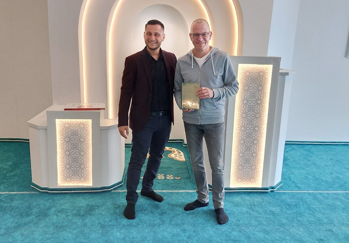 Im Anschluss ging es weiter zur albanischen Moscheegemeinde, wo der Vorsitzende des IKRA-Vereins Elvir Jellaj die Gäste herzlich empfing. Dieses Mal erhielt Oliver Kellner als Dank für die gute Kooperation einen Koran in deutscher Sprache.