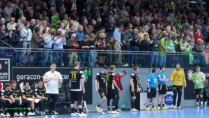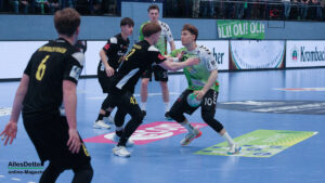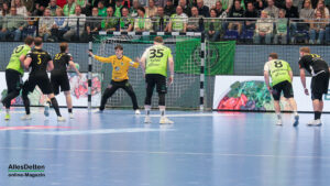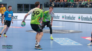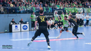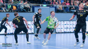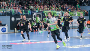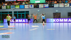 Die Halle brodelte am Freitagabend bereits vor dem Anpfiff. Die Zuschauer riss es schon vor Spielbeginn aus den Sitzen, die Stimmung war super. Die Emsdettener Spieler bedankten sich mit einem konzentrierten Auftritt und beherzter Abwehrarbeit. „Der Hexer“ Oliver Krechel verriegelte sein Tor so gut er konnte und leistete einmal mehr seinen Beitrag dazu, die EMSHalle so richtig anzuzünden. Spätestens nach etwa 15 gespielten Minuten nahm dann auch der TVE-Express so richtig Fahrt auf und baute den Vorsprung aus. Insbesondere Dettens Ungarn-Rakete Akos Szeles schien Spaß an der Partie zu haben. Acht Treffer aus dem Spiel heraus erzielte Szeles am Freitagabend. Nach 19 gespielten Minuten wurde die Spielzeit das erste mal im Emsdettener Kader verteilt. Luca Klein und Marius Kluwe kamen in die Partie. Zur Halbzeit stand bereits ein beruhigender 20:10 Zwischenstand auf der Anzeigetafel