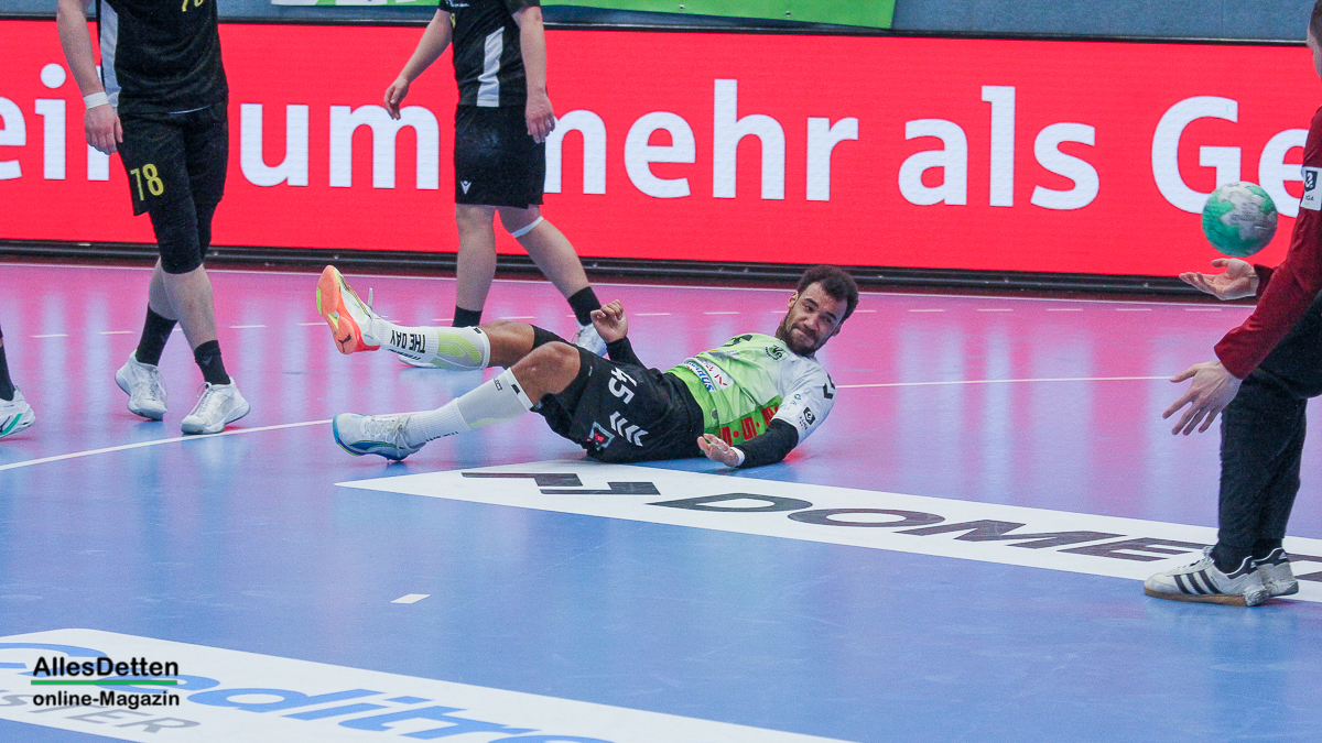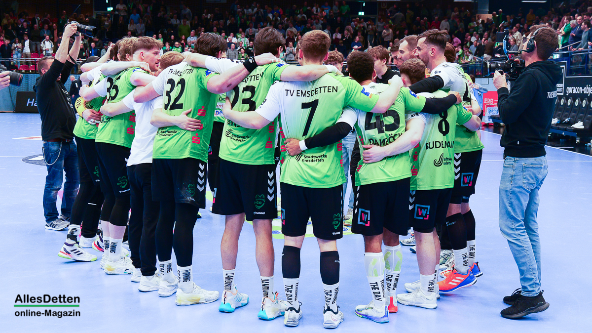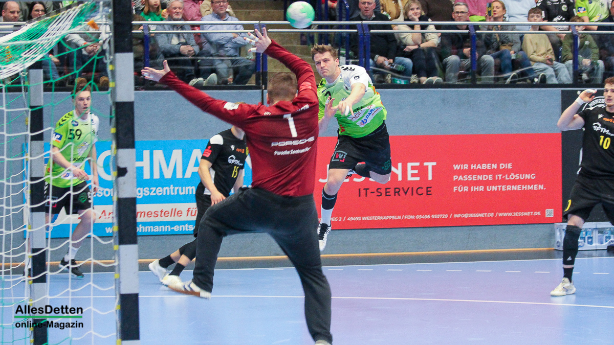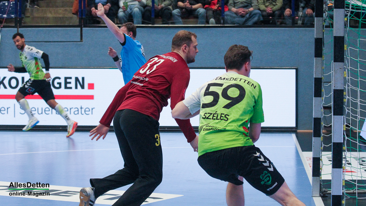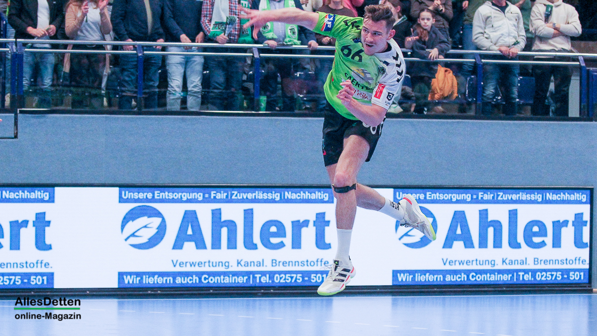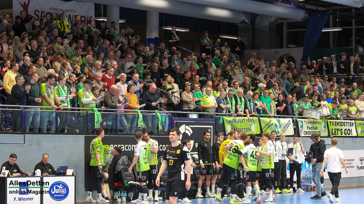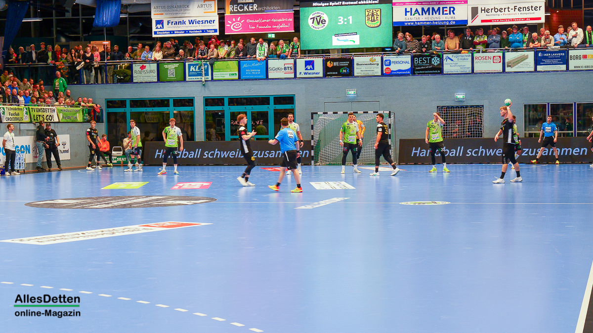 Die Halle brodelte am Freitagabend bereits vor dem Anpfiff. Die Zuschauer riss es schon vor Spielbeginn aus den Sitzen, die Stimmung war super. Die Emsdettener Spieler bedankten sich mit einem konzentrierten Auftritt und beherzter Abwehrarbeit. „Der Hexer“ Oliver Krechel verriegelte sein Tor so gut er konnte und leistete einmal mehr seinen Beitrag dazu, die EMSHalle so richtig anzuzünden. Spätestens nach etwa 15 gespielten Minuten nahm dann auch der TVE-Express so richtig Fahrt auf und baute den Vorsprung aus. Insbesondere Dettens Ungarn-Rakete Akos Szeles schien Spaß an der Partie zu haben. Acht Treffer aus dem Spiel heraus erzielte Szeles am Freitagabend. Nach 19 gespielten Minuten wurde die Spielzeit das erste mal im Emsdettener Kader verteilt. Luca Klein und Marius Kluwe kamen in die Partie. Zur Halbzeit stand bereits ein beruhigender 20:10 Zwischenstand auf der Anzeigetafel