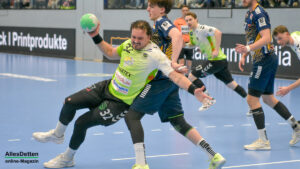 Denn der Gast aus der Niedersächsischen Landeshauptstadt Hannover hatte nicht vor, in der vollen Hallen den Punktelieferanten zu spielen. Der Kader verfügt durchaus über potential, und genau dieses konnten die Spieler von Trainer Robin John vom Anpfiff weg andeuten. Nicht nur der erste Treffer gehörten den Gästen, nach vier gespielten Minuten drehte Fynn Brandes zum Jubel ab: 1:4 aus Sicht des TV Emsdetten! Als Zugabe gab es noch eine zweiminütige Unterzahl, Sergej Gorpishin hatte soeben eine Zeitstrafe erhalten. Wer nicht glaubte, dass Anderten durchaus gefährlich sein kann musste jetzt anerkennen dass der TSV hier top motiviert auftrat. Es dauerte eine Viertelstunde, ehe Yannick Terhaers Torerfolg zum 10:9 die erste Führung für Emsdetten bedeutete. Andre Meuser, mit zehn Treffern bester TVE Torschütze, erzielte vier Minuten vor der Halbzeit mit dem 18:14 die erste vier Tore Führung. Der TSV ging weiter konzentriert an die Sache heran, ließ sich weder von der Halle noch von der Emsdettener Mannschaft beeindrucken und glich gut eine Minute vor dem Halbzeitpfiff zum 18:18 aus. Andre Meuser war es dann wieder, der Sekunden vor dem Ende mit dem 20:18 den Schlusspunkt des ersten Durchgangs setzte.