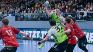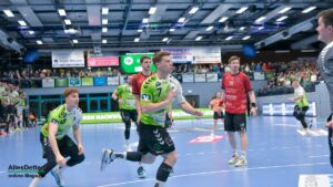 Holprig war am Samstagabend nur der Auftakt. Knapp neun Minuten waren bereits gespielt, und der TVE hatte erst zwei Treffer erzielt. Da die Deckung ihre Arbeit gut erledigte und Oliver Krechel sich einmal mehr den Spitznamen „Der Hexer“ verdiente, hatte die kleine Torflaute kaum Einfluss auf die Partie: Fynn Hasenkamp netzte wenig später zum 3:3 Ausgleich ein. Yannick Terhaer und sein Kollege auf der linken Außenbahn, Eric Damböck, zündeten im Anschluss kurz den Turbo und brachten ihre Mannschaft auf die Siegerstraße. Die Gäste versuchten den sich andeutenden Emsdettener Lauf mit einer Auszeit zu unterbrechen. Das klappte nicht: Die grünen Herzblut-Handballer zogen ihren Job konsequent durch und bauten den Vorsprung weiter aus. Mit zunehmender Spieldauer ging der HSG Varel sichtbar die Puste aus. Zur Pause stand es bereits 18:10 für unsere heimischen Handballer.