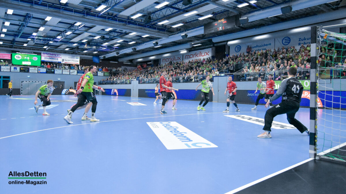 Holprig war am Samstagabend nur der Auftakt. Knapp neun Minuten waren bereits gespielt, und der TVE hatte erst zwei Treffer erzielt. Da die Deckung ihre Arbeit gut erledigte und Oliver Krechel sich einmal mehr den Spitznamen „Der Hexer“ verdiente, hatte die kleine Torflaute kaum Einfluss auf die Partie: Fynn Hasenkamp netzte wenig später zum 3:3 Ausgleich ein. Yannick Terhaer und sein Kollege auf der linken Außenbahn, Eric Damböck, zündeten im Anschluss kurz den Turbo und brachten ihre Mannschaft auf die Siegerstraße. Die Gäste versuchten den sich andeutenden Emsdettener Lauf mit einer Auszeit zu unterbrechen. Das klappte nicht: Die grünen Herzblut-Handballer zogen ihren Job konsequent durch und bauten den Vorsprung weiter aus. Mit zunehmender Spieldauer ging der HSG Varel sichtbar die Puste aus. Zur Pause stand es bereits 18:10 für unsere heimischen Handballer.