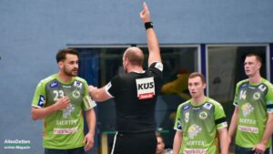 Nach einer Viertelstunde gab es eine schmerzhafte Szene für Torhüter Ante Vukas. Er wurde von Linksaußen Jakob Bormann mit dem Ball im Gesicht getroffen. Dafür gab es eine Zeitstrafe. Bormanns Treffer war keine Absicht, die Entschuldigung folgte sofort. Ärgerlich: Robin Jansen erhielt kurz darauf eine Zeitstrafe für einen Wechselfehler der Emsdettener Bank. Davon ließen sich die Dettener aber nicht beeindrucken, zogen Stück für Stück davon. Jansen erhielt zehn Minuten später dann die gelbe Karte für eine Abwehraktion. Da er vorher schon eine Zeitstrafe erhalten hatte, war das nicht regelkonform. Das Schiedsrichterduo bemerkte dies und schickte Jansen das zweite mal mit einer Zeitstrafe auf die Bank. (Erklärung aus dem Regelwerk im Anhang)