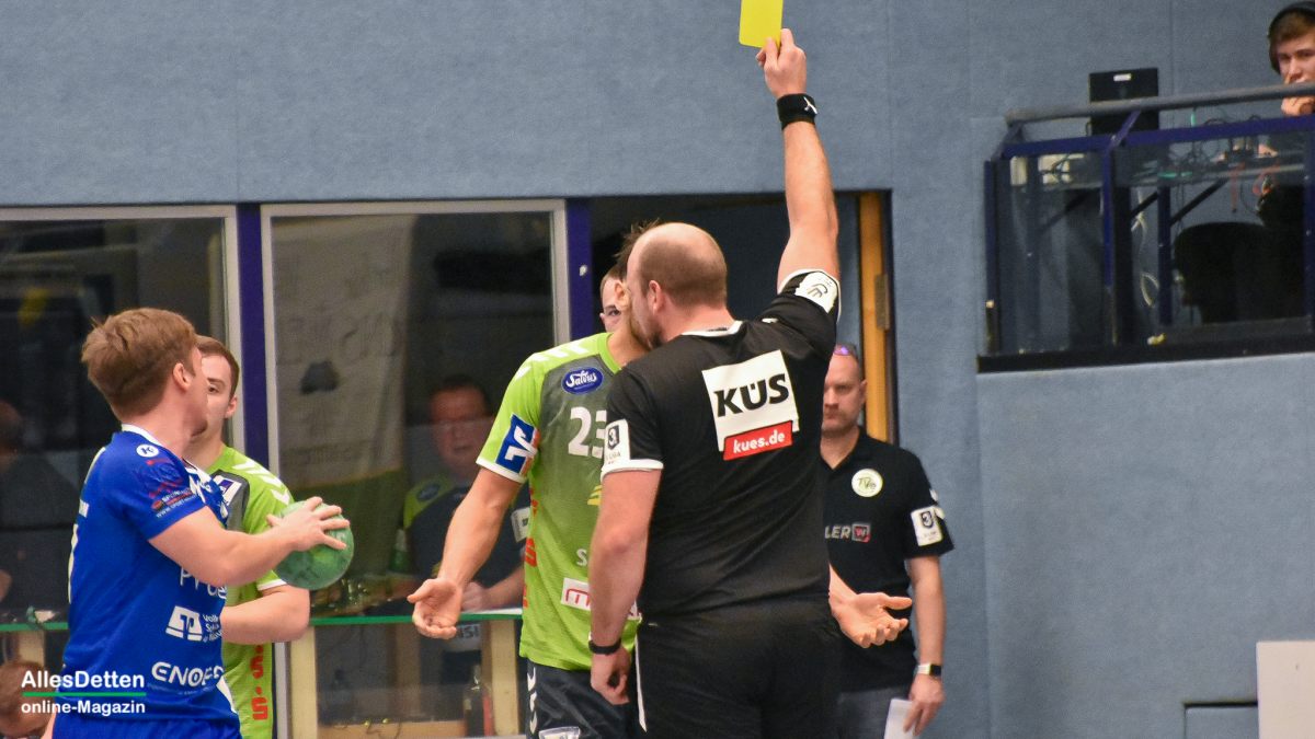 Nach einer Viertelstunde gab es eine schmerzhafte Szene für Torhüter Ante Vukas. Er wurde von Linksaußen Jakob Bormann mit dem Ball im Gesicht getroffen. Dafür gab es eine Zeitstrafe. Bormanns Treffer war keine Absicht, die Entschuldigung folgte sofort. Ärgerlich: Robin Jansen erhielt kurz darauf eine Zeitstrafe für einen Wechselfehler der Emsdettener Bank. Davon ließen sich die Dettener aber nicht beeindrucken, zogen Stück für Stück davon. Jansen erhielt zehn Minuten später dann die gelbe Karte für eine Abwehraktion. Da er vorher schon eine Zeitstrafe erhalten hatte, war das nicht regelkonform. Das Schiedsrichterduo bemerkte dies und schickte Jansen das zweite mal mit einer Zeitstrafe auf die Bank. (Erklärung aus dem Regelwerk im Anhang)