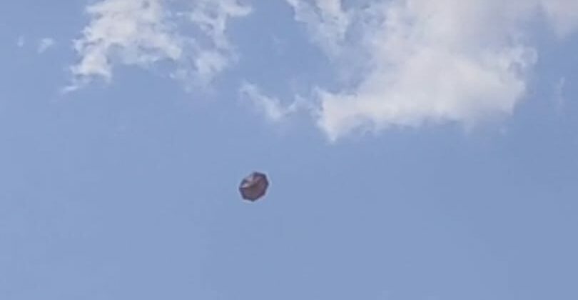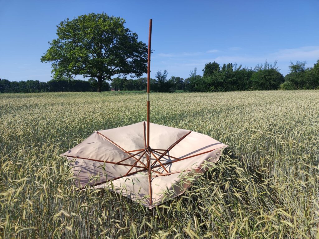 Nein, das ist keine verfrühte Sommerlochmeldung! Was hier gestern fröhlich über dem Baugebiet Lerchenfeld durch die Luft gewirbelt ist, ist nicht etwa ein Regenschirm, wie man auf dem ersten Blick meinen könnte. Es handelt sich tatsächlich um einen ausgewachsenen Sonnenschirm. Gelandet ist er dann in einem Kornfeld hinter dem Gehöft Brumley an der Nordwalder Straße.