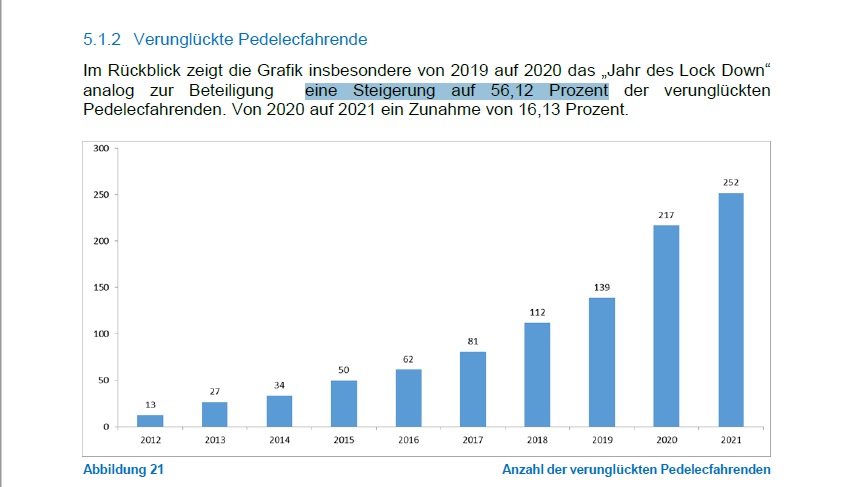 Von 2019 bis 2020 ist bei den Unfällen mit verunglückten Pedelec Fahrenden eine Steigerung auf 56,12%% dokumentiert. Die Unfallzahlen stiegen von 139 (2919) auf 217 (2020 – das Jahr des Lock Down) und 252 in 2021. Das macht eine negative Zunahme von 16,13 Prozent um 35 auf 252. Drei Pedelec Fahrende wurden 2021 tödlich verletz. Positiv sei jedoch, dass mit 60 weniger Personen schwer verletzt wurden (-16,67%) im Vergleich zum Vorjahr und 189 (+30,34%) mit leichten Verletzungen davonkamen