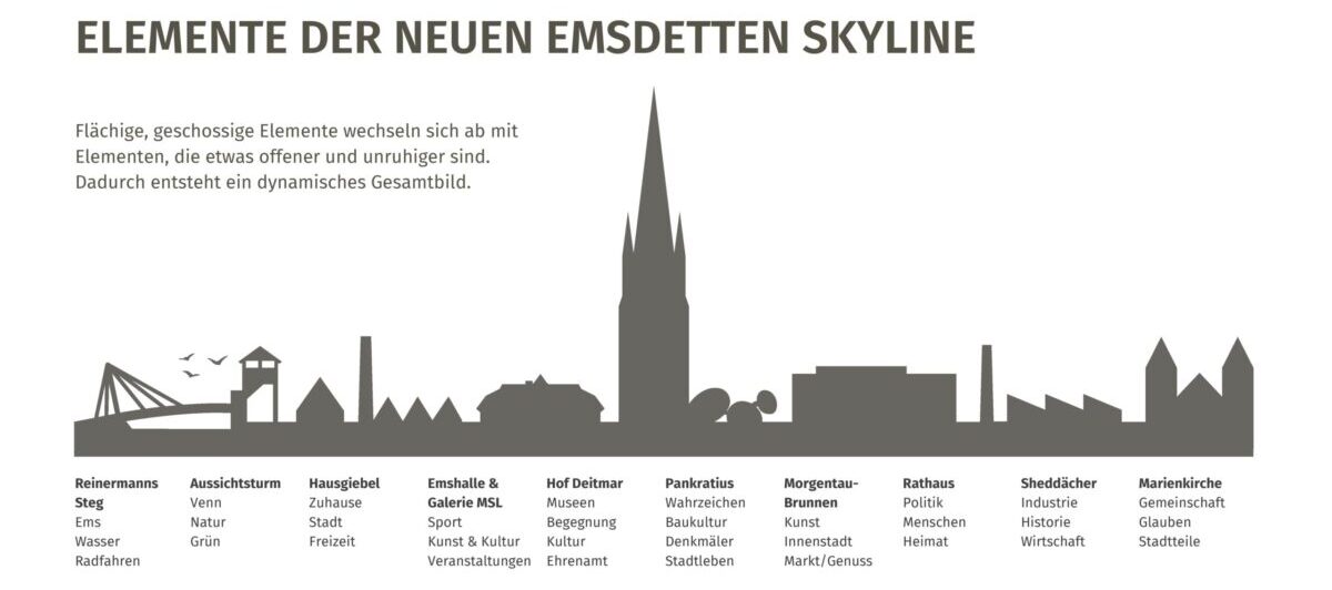 Die Skyline ist beliebt in Emsdetten und fest im Stadtbild verankert: Vor Jahren recht spontan entstanden, vielfältig im Einsatz und visuell eng mit dem Instagram-Kanal EmsdettenLeben verknüpft, ob online oder auf Shirts, Taschen und Tassen. Aber: grafisch war noch Luft nach oben. Einige Häusergiebel erzählten eher wenig, die Darstellung war sehr kirchenlastig, technisch nicht immer sauber. „Der Wunsch, die Entwicklung des Verkehrsvereins als innovativem Akteur im Stadtmarketing auch im Erscheinungsbild sichtbar zu machen, ohne Bewährtes über Bord zu werfen, stand schon länger im Raum“, sagt Lukas Furth, Geschäftsführer des Verkehrsvereins Emsdetten. „Mit professioneller grafischer Unterstützung von außen und der Kreativität unseres Teams ist daraus eine überzeugende Weiterentwicklung entstanden.“