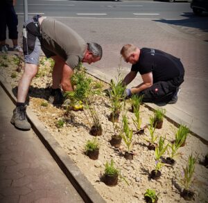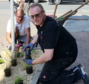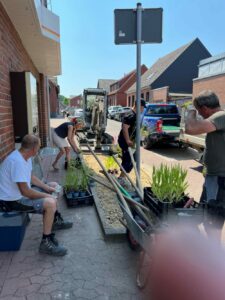 Von der Stadt gab es eine Auflistung mit Flächen, deren Entsiegelung aktuell geplant ist. „Aus dieser Liste haben wir uns dann diese zwei Standorte ausgesucht“ erklärt Wüller und zeigt auf einem Plan die Flächen beidseitig der Martha- und der Emmastraße jeweils Ecke Borghorster Straße. Die Flächen zusammen ergeben ca. 40 qm. Diese galt es nun am Freitag umzugestalten. Das Pflaster musste entfernt und die Pflastergrundlage ausgebaggert werden. Danach wurde die Fläche wieder aufgefüllt mit speziellem Pflanzsubstrat. Zum Schluss blieb noch das setzen der neuen Pflanzen. „Diese sind alle aus zertifiziertem Anbau“ berichtet Stefan Hüls. Die gesamten Kosten des Einsatzes für Material, Pflanzen, Maschinen und Personal teilen sich die drei beteiligten Firmen gleichermaßen.