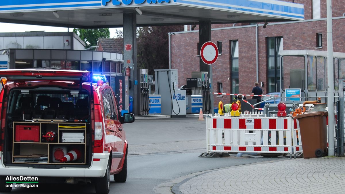 Zeitgleich gab es einen Einsatz an einer Tankstelle hinterm Bahnhof. Die Gasleitung die aus dem unterirdisch liegenden Tank für die Versorgung der Zapfsäule zuständig ist, war undicht. Zeugen war der Gasgeruch aufgefallen. Die Tankstelle wurde daraufhin großräumig abgesperrt. Um die Zuleitung reparieren zu können musste zunächst der Gasdruck im oberirdischen Bereich abgelassen werden. Auch hier gab es bis zur Erstellung dieser Meldung keinen Personenschaden